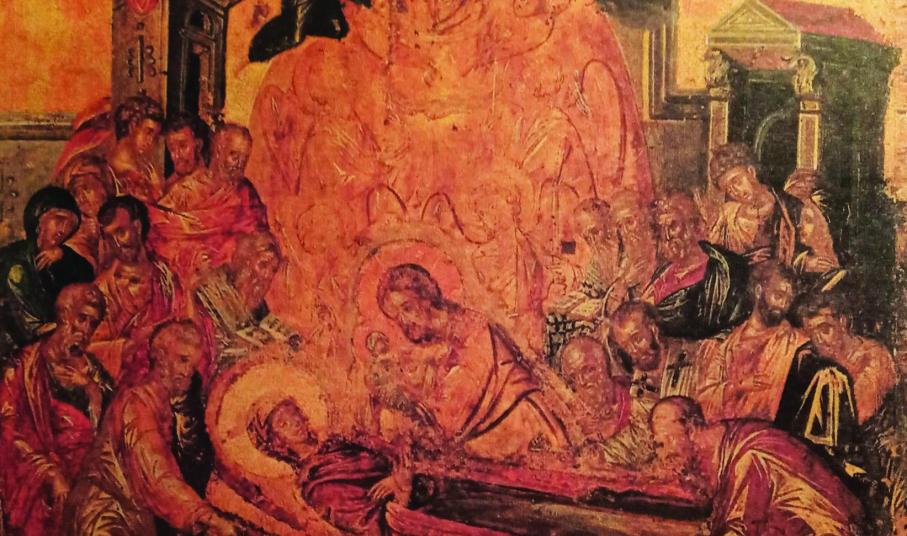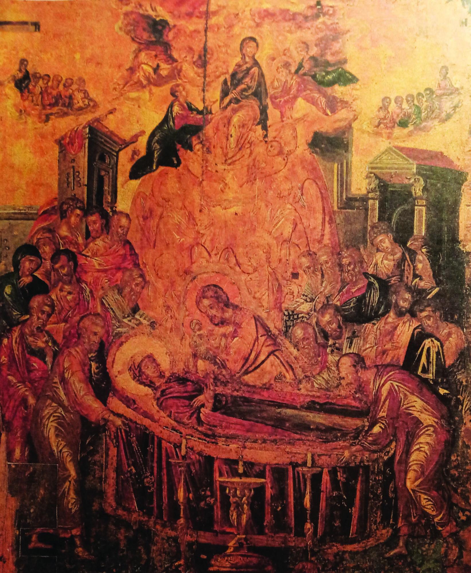 Δίπλα στον λαξευτό της τάφο στη Γεσθημανή, έξω από την Ιερουσαλήμ, τρεις μέρες και τρεις νύχτες οι Απόστολοι έψελναν υμνωδίες. Όταν μετά τρεις μέρες έφθασε και ο Θωμάς, άνοιξαν την λάρνακα για να την προσκυνήσει και... μια θεία ευωδία σκόρπισε τριγύρω. Σύμφωνα με τα γραπτά κείμενα, μέσα στον τάφο υπήρχε η “τίμια εσθήτα Της”. Και αυτήν την μετέφεραν στον περίφημο ναό των Βλαχερνών στην Κωνσταντινούπολη...”