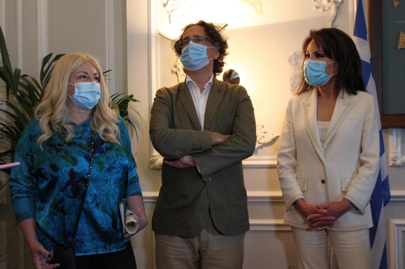 Αμέσως μετά, η κ. Αγγελοπούλου και οι συνεργάτες της επισκέφτηκαν το εμβληματικό Δημαρχιακό Μέγαρο της Ερμούπολης, όπου είχαν την ευκαιρία να συζητήσουν γύρω από τις αναπτυξιακού χαρακτήρα προτάσεις του Δήμου Σύρου – Ερμούπολης στο πλαίσιο συμμετοχής του στον εορτασμό των 200 ετών από την Ελληνική Επανάσταση.