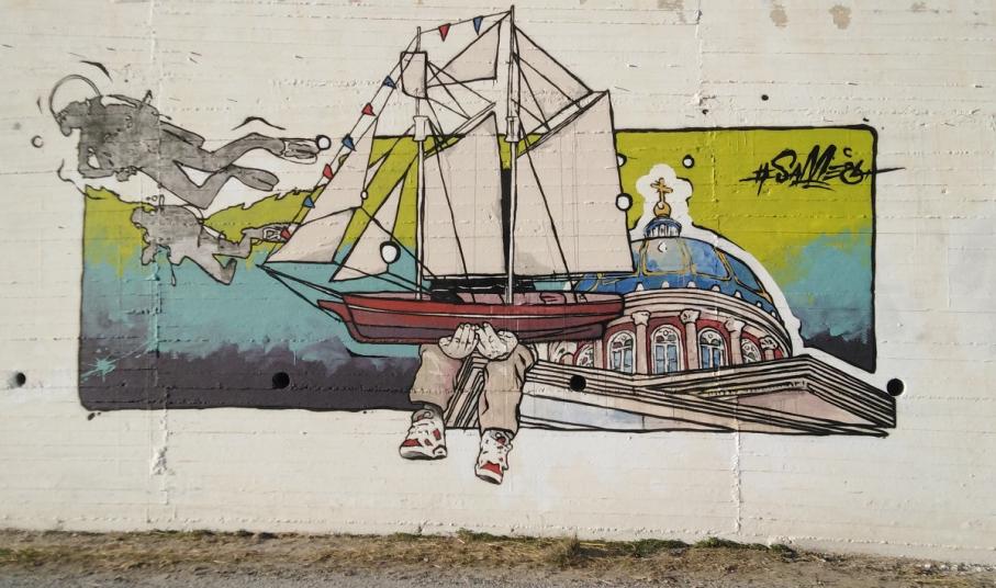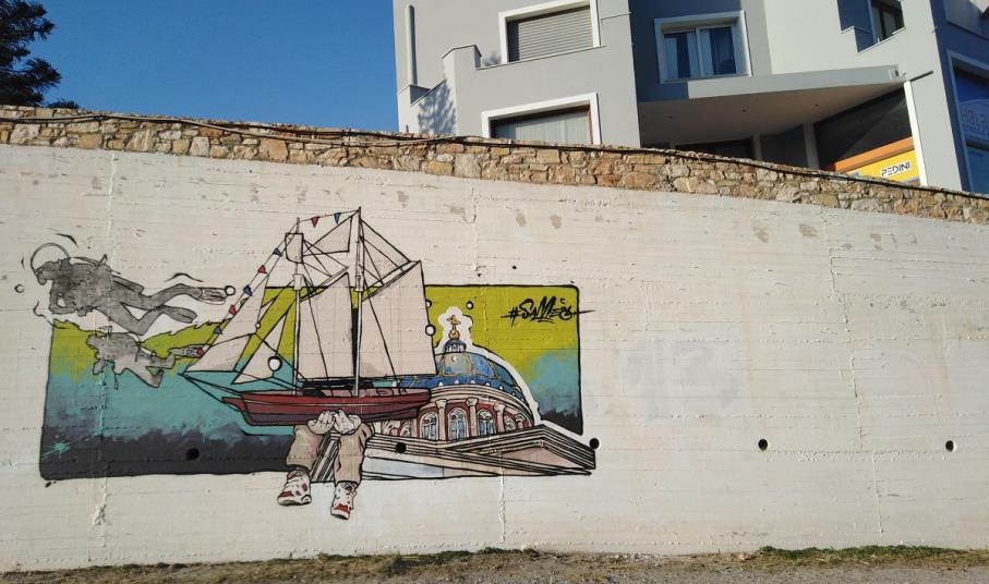 Όσοι περάσουν από το συγκεκριμένο σημείο θα θαυμάσουν αποτυπωμένο τον τρούλο του Αγίου Νικολάου, το στοιχείο που έκανε ιδιαίτερη εντύπωση για την αρχιτεκτονική και το χρώμα του από την πρώτη μέρα του Same84 στο νησί. Σ’ ένα τέτοιον τόπο με τόσο μεγάλη ναυτική ιστορία δεν θα μπορούσε να παραλείψει το συγκεκριμένο στοιχείο, που συνδέεται με το γεγονός ότι ο Άγιος Νικόλαος θεωρείται ο κατ' εξοχήν προστάτης άγιος των Ναυτικών. Στη συνέχεια κατά την περιπλάνησή του και τις συναντήσεις με τους κατοίκους της Σύρου, τα πρόσωπα μοιράστηκαν τη σύνδεση που έχουν με το νησί ως τον ξεχωριστό τόπο των παιδικών αναμνήσεών τους. Έτσι στο έργο ο καλλιτέχνης απεικονίζει ένα παιδί να κρατάει στα χέρια του ένα μεγάλο ξύλινο καράβι. Τέλος, στο πίσω μέρος της τοιχογραφίας έχουν αποτυπωθεί δυο δύτες εμπνευσμένοι από τη μαγεία και τη φυσική ομορφιά που κρύβει ο βυθός, σαν μια άλλη ανώτερη μορφή τέχνης.