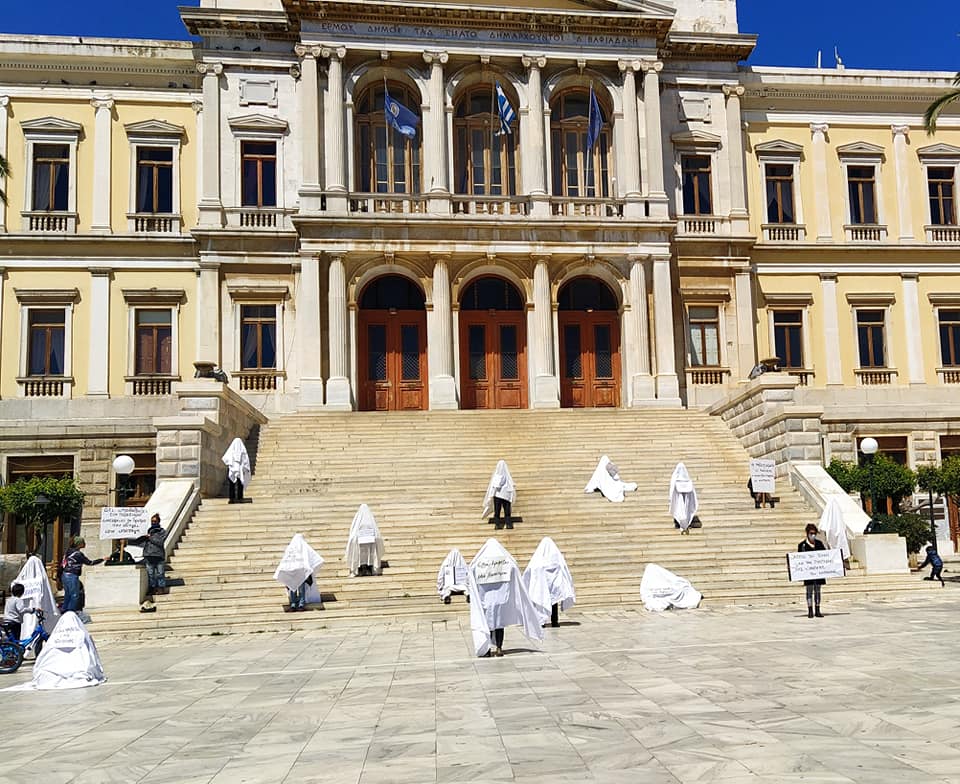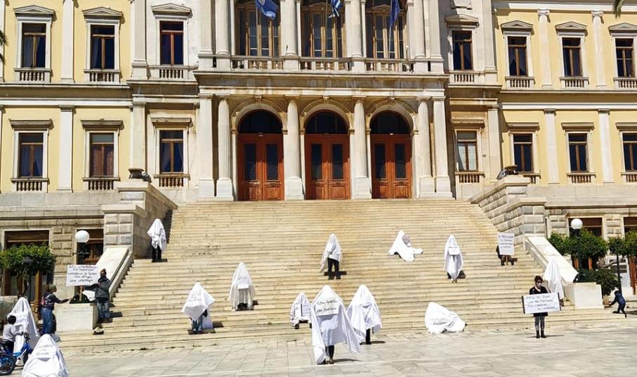 Σε μια συμβολική κίνηση προχώρησαν καλλιτέχνες που ζουν και δημιουργούν στη Σύρο για να εκφράσουν την αγωνία τους σχετικά με τη ζοφερή πραγματικότητα του φόβου και των περιοριστικών μέτρων που έχει μετατρέψει τους χώρους πολιτισμού σε «στοιχειωμένα σπίτια» και όσους τον υπηρετούν σε «φαντάσματα».