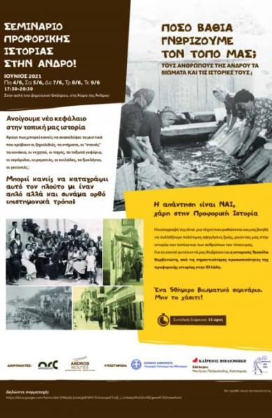 Το σεμινάριο εισαγωγής στην Προφορική Ιστορία… στην Άνδρο και για την Άνδρο, συνολικής διάρκειας 15 ωρών, θα διεξαχθεί από 4 έως 9 Ιουνίου 2021 (17:30 – 20:30), στην αυλή του Δημοτικού Κινηματοθεάτρου, στη Χώρα.