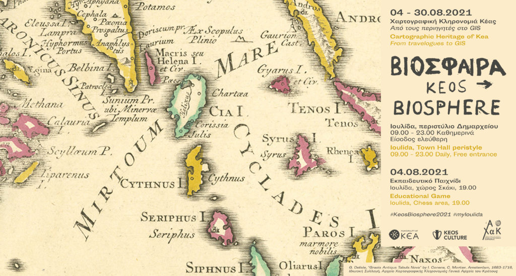 Ο Δήμος Κέας, υπό την επιμέλεια του μη κερδοσκοπικού πολιτιστικού φορέα Κέως Πολιτισμός – Keos Culture, διοργάνωσε στο πλαίσιο του θεσμού της Βιόσφαιρας την έκθεση με τίτλο “Χαρτογραφική κληρονομιά Κέας, Από τους Περιηγητές στο GIS”.