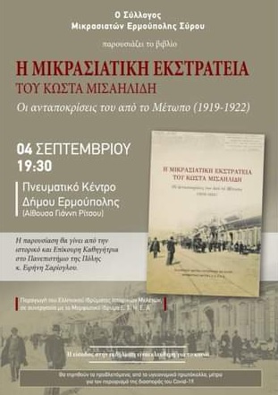 Στο πλαίσιο των εκδηλώσεων τιμής και μνήμης για τα 99 χρόνια από την Μικρασιατική καταστροφή, ο Σύλλογος Μικρασιατών Ερμούπολης Σύρου προσκαλεί το κοινό στην παρουσίαση του βιβλίου του Μικρασιάτη δημοσιογράφου και πολεμικού ανταποκριτή στο Μέτωπο, Κώστα Μισαηλίδη «Μικρασιατική Εκστρατεία του Κώστα Μισαηλίδη: Οι ανταποκρίσεις του από το Μέτωπο (1919-1922).