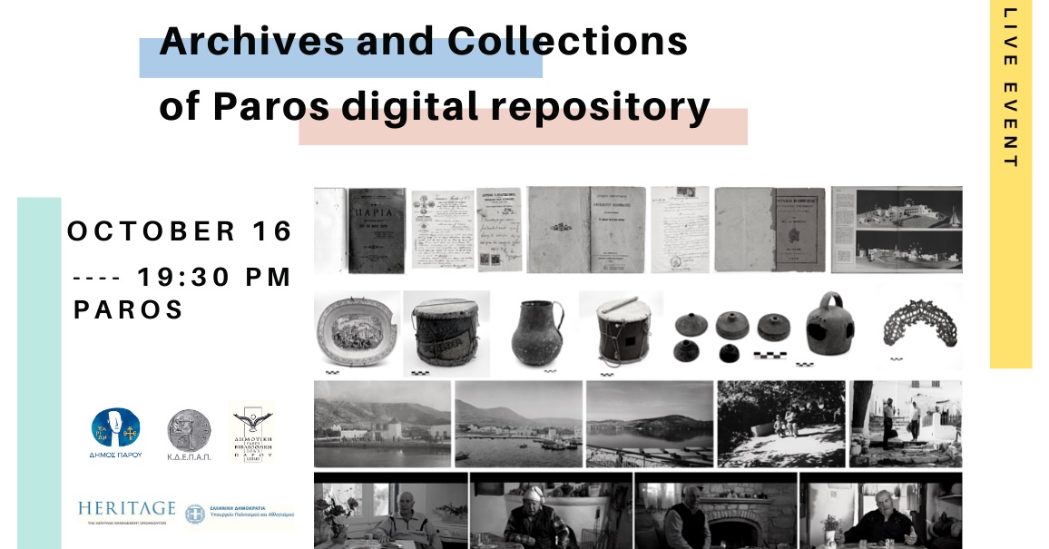 Η Koινωφελής Δημοτική Επιχείρηση Πολιτιστικής Ανάπτυξης Πάρου (ΚΔΕΠΑΠ), η Δημοτική Βιβλιοθήκη Πάρου «Γιάννης Γκίκας» και η Πρωτοβουλία για την Ανάδειξη της Πολιτιστικής Κληρονομιάς σας προσκαλούν στην εκδήλωση για την παρουσίαση του Ψηφιακού Αποθετηρίου «Αρχεία και Συλλογές της Πάρου» το Σάββατο 16 Οκτωβρίου 2021 και ώρα 19:30.
