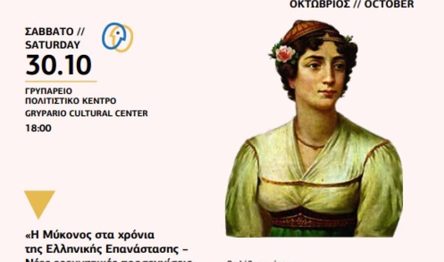 Στα πλαίσια του Mykonos Art Festival και με την ευκαιρία της επετείου των 200 χρόνων από την Ελληνική Επανάσταση του 1821, ο ΠΑΚΟ " Γ. ΑΞΙΩΤΗΣ" δθιοργανώνει διημεριδα με ομιλίες ιστορικού περιεχομένου στο Γρυπάρειο Πολιτιστικό Κέντρο στις 18.00, 30 & 31 Οκτωβρίου 2021