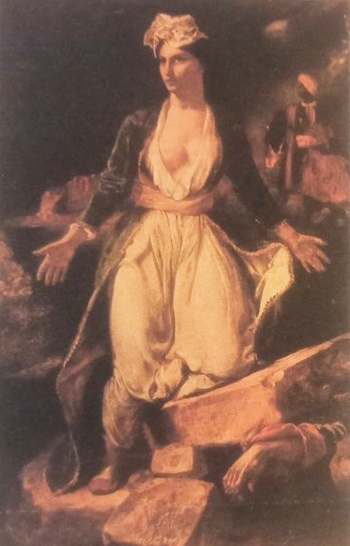 Όλη αυτή η “Φιλελληνική τρέλα και αγάπη” δεν άφησε ανεπηρέαστο το χώρο των εικαστικών τεχνών. Πολλοί ζωγράφοι έφτιαξαν πίνακες που είχαν ζωγραφίσει ελληνικά θέματα, που άκουγαν, μάθαιναν και ζωγράφιζαν. Το ενδιαφέρον των Ευρωπαίων για την αρχαία Ελλάδα είχε αντικατασταθεί για το σύγχρονο έθνος που στέναζε κάτω από το ζυγό του κατακτητή. Βέβαια, είχε γίνει γνωστό πως οι νεώτεροι Έλληνες είναι άξιοι απόγονοι των προγόνων τους. Βέβαια, η φτώχεια , η κακομοιριά και τόσα άλλα αρνητικά και θετικά σχόλια της σκλαβωμένης Ελλάδας γίνονταν γνωστά στις ξένες χώρες. Όμως λόγω της ανάγκης για την ελευθερία της χώρας, ήταν τόσοι πολλοί οι ξένοι που θέλησαν να βοηθήσουν τη χώρα με τον άριστο και μοναδικό αρχαίο πολιτισμό. Η απελευθέρωση της Ελλάδας, ως έθνους, είχε γίνει και καθήκον των Δυτικών. Κανένας Έλληνας δεν ζήτησε τη βοήθειά τους, αλλά μόνοι τους το θέλησαν. Υπάρχει ένα κείμενο από τον τότε διάδοχο της Βαυαρίας, ο οποίος μεταξύ άλλων είχε δηλώσει ότι “χρωστάμε στους Έλληνες την ελευθερία τους, χάριν των προγόνων τους.” Συχνά, οι κακοτυχίες των Ελλήνων αποτελούσαν πηγή έμπνευσης για τους καλλιτέχνες, περισσότερο από τις επιτυχίες τους. Τα έργα που κατασκεύασαν τότε οι Ευρωπαίοι ζωγράφοι, αυτής της εποχής, είχαν μεγάλες επιτυχίες. Σε σχέση με τους άλλους Ευρωπαίους, οι Γάλλοι είναι αυτοί που εμπνέονται περισσότερο, εκείνη την εποχή. Σφαγές, πυρπολήσεις και μάχες είναι τα θέματα που συχνά αντικρίζουμε στους πίνακες αυτής της εποχής. Στο σαλόνι του Παρισιού του 1827, δέκα απτά έργα από αυτά που εκτίθενται έχουν ελληνικά θέματα. Ο ζωγράφος που μετέφερε καλύτερα από τους άλλους το ηρωικό και το τραγικό στοιχείο αυτού του Αγώνα ήταν ο ζωγράφος Ευγένιος Ντελακρουά ( Eugene Delacroix) Το σημαντικό είναι ότι ο Ντελακρουά ποτέ δεν επισκέφθηκε την Ελλάδα! Αγάπησε και θαύμασε την Ελλάδα από τα τόσα κείμενα που είχε διαβάσει για την αρχαία και την νεότερη ελληνική ιστορία. Ο Γάλλος αυτός ζωγράφος, ήταν από τους σημαντικότερους στην ιστορία της τέχνης. Γεννήθηκε το 1798 στο Σάρεντόν - Σαιν Μόρις και πέθανε στο Παρίσι το 1863. Υπήρξε ο σημαντικότερος εκπρόσωπος του κινήματος του ρομαντισμού στη ζωγραφική στη Γαλλία. Άνοιξε νέους ορίζοντες για τη ζωγραφική τέχνη και πολλοί μεγάλοι ζωγράφοι των μετέπειτα εποχών θαύμασαν και αναγνώρισαν την “άριστη και μοναδική εργασία του.” Επί σαράντα πέντε χρόνια εργαζόταν με έναν πρωτόγνωρο ενθουσιασμό γι’ αυτό και η καλλιτεχνική του παραγωγή υπήρξε τεράστια. Μετά το θάνατό του οι ειδικοί ανεκάληψαν μεγάλα ζωγραφικά του έργα, (γκραβούρες, λιθογραφίες, σκίτσα πίνακες κ.α. που έφθαναν τα 1625 κ.α.).