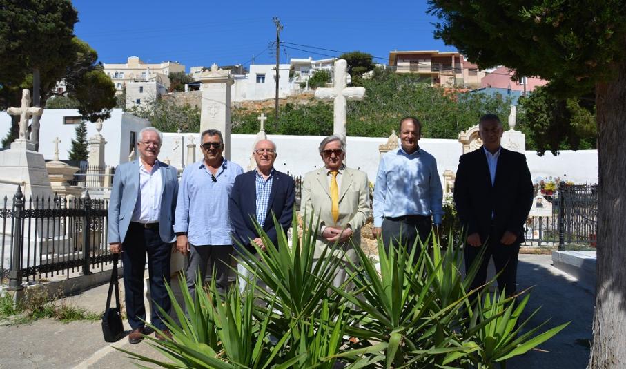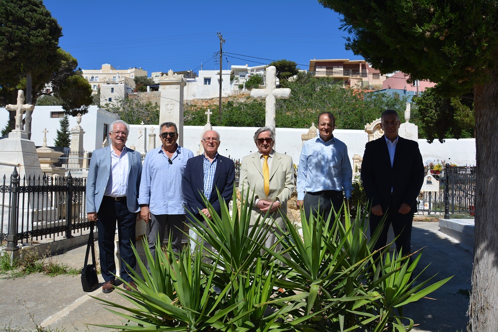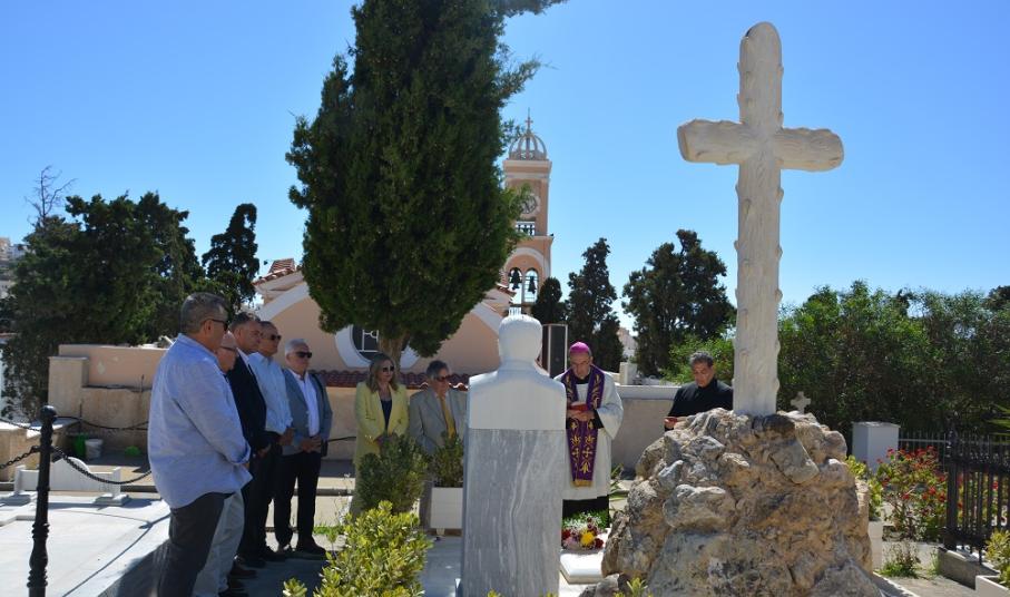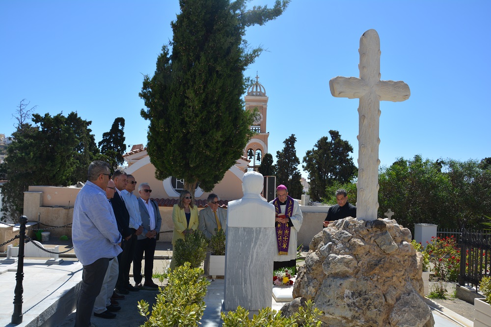 Από νωρίς το πρωί, ο Βασίλης Βαμβακάρης, είχε επισκεφθεί το μνημείο του πατέρα του στο καθολικό κοιμητήριο για την τέλεση τρισάγιου στη μνήμη του, από τον καθολικό επίσκοπο π. Πέτρο Στεφάνου. Στη συνέχεια,  επισκέφθηκε τα εκπαιδευτήρια Δελασάλ και το Βαμβακάρειο Γυμνάσιο, του οποίου είναι μέγας δωρητής, και αφού περιηγήθηκε στους χώρους του σχολείου, συνομίλησε σε ευχάριστο κλίμα με παιδιά κι εκπαιδευτικούς.