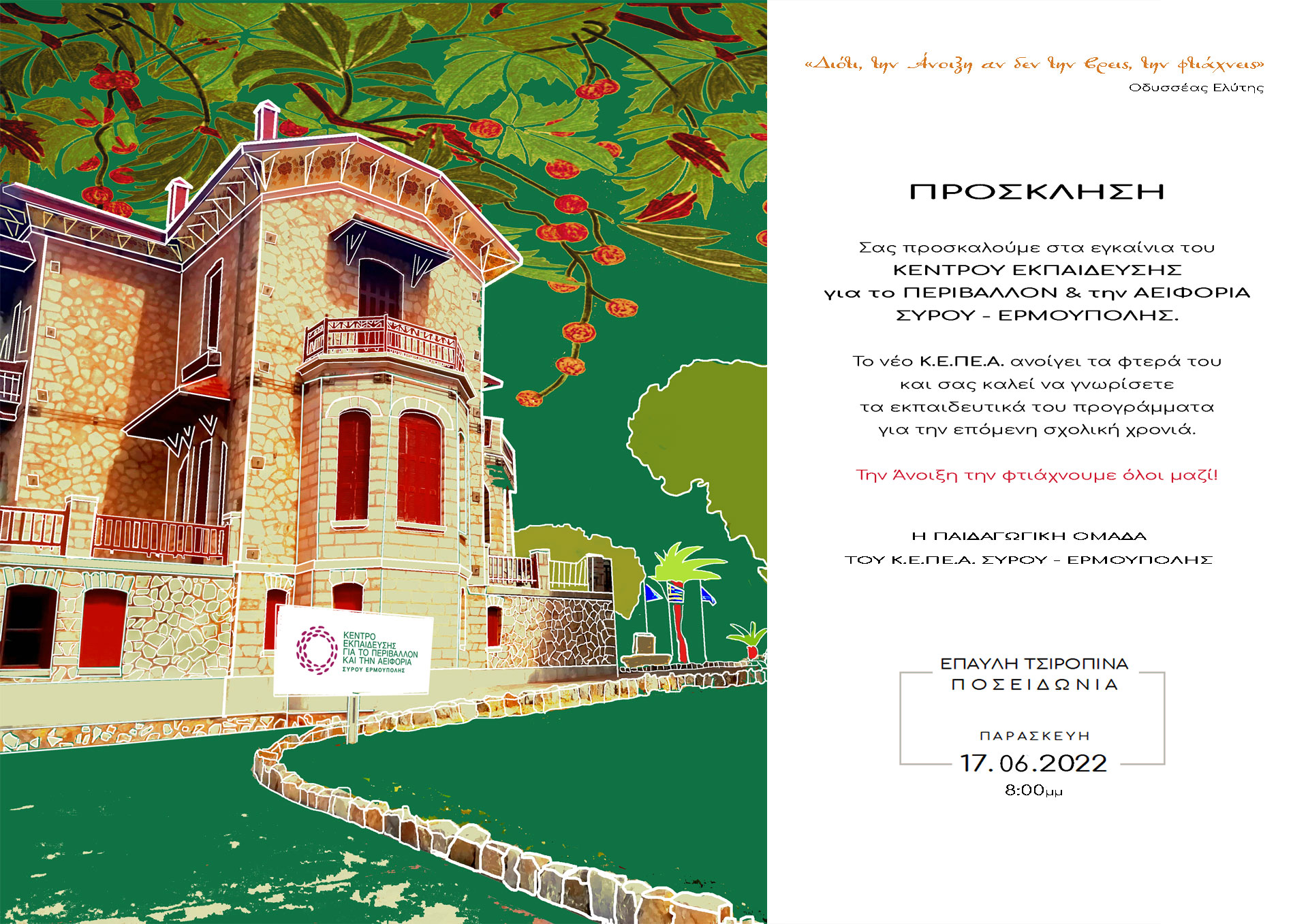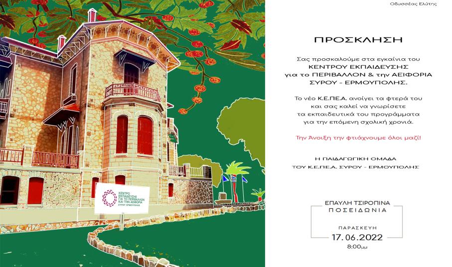 Σε εύθυμο και εορταστικό κλίμα πραγματοποιήθηκαν τα εγκαίνια του κέντρου εκπαίδευσης για το περιβάλλον και την αειφορία Σύρου – Ερμούπολης (ΚΕ.ΠΕ.Α.). Από νωρίς, παιδιά, γονείς κι επισκέπτες συγκεντρώθηκαν στον προαύλιο χώρο της έπαυλης Τσιροπινά, η οποία θα φιλοξενεί την έκθεση "Το μικρό είναι όμορφο" και τα έργα 496 σπουδαστών από νηπιαγωγεία, δημοτικά και το ΕΕΕΕΚ Σύρου, με θέμα τα αγριολούλουδα των Κυκλάδων, μέχρι την Πέμπτη 23 Ιουνίου.