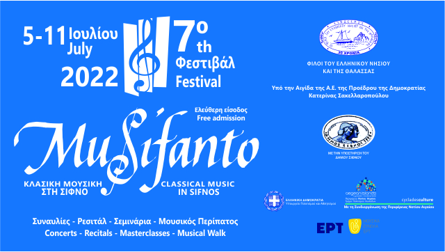 Ο Σύνδεσμος «Οι Φίλοι του Ελληνικού Νησιού και της Θάλασσας» διοργανώνει το 7ο Φεστιβάλ Κλασικής Μουσικής στη Σίφνο «MuSifanto 2022» που θα πραγματοποιηθεί στις 5-11 Ιουλίου 2022.