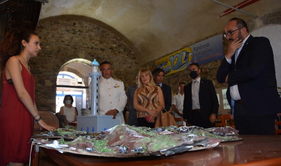 Στη συνέχεια, οι επίσημοι ξεναγήθηκαν στην έκθεση του Ναυτικού Ομίλου Σύρου, ενημερώθηκαν για την ιστορία του Φάρου της Σύρου, ενώ έγινε και μια παρουσίαση των διαδραστικών εκθεμάτων και εφαρμογών που έχουν σχεδιάσει οι φοιτήτριες Αργυρώ Καραχάλιου, Ζωή Μεταξά και Δήμητρα Μακρυκώστα, του Τμήματος Μηχανικών Σχεδίασης Προϊόντων και Συστημάτων του Πανεπιστημίου Αιγαίου και αφορούν στην ναυτική ιστορία του νησιού.