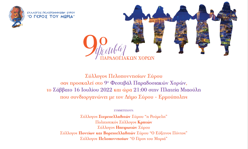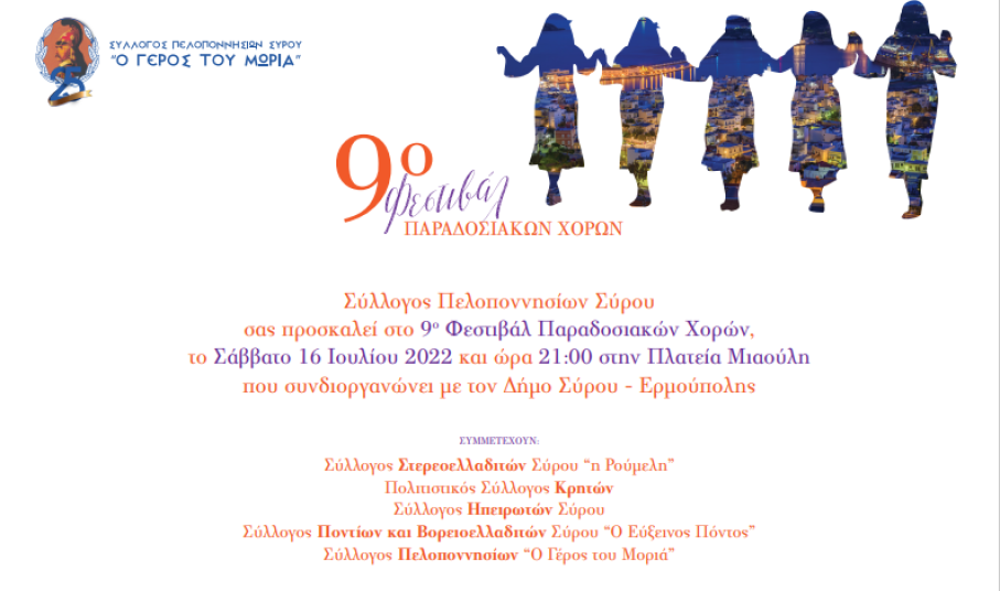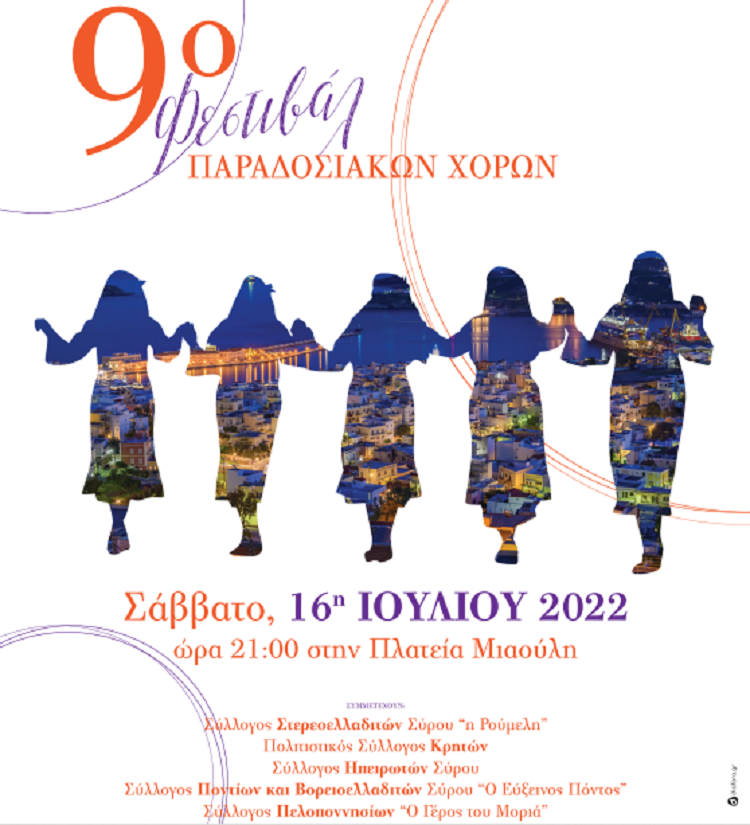 Το Σάββατο 16 Ιουλίου 2022 και ώρα 21.00, επιστρέφει στην πλατεία Μιαούλη το 9ο Φεστιβάλ Παραδοσιακών χορών που διοργανώνουν ο Σύλλογος Στερεοελλαδιτών Σύρου "η Ρούμελη", ο Πολιτιστικός Σύλλογος Κρητών, Σύλλογος Ηπειρωτών Σύρου, Σύλλογος Ποντίων και Βορειοελλαδιτών Σύρου "Ο Εύξεινος Πόντος", Σύλλογος Πελοποννησίων "Ο Γέρος του Μωριά".