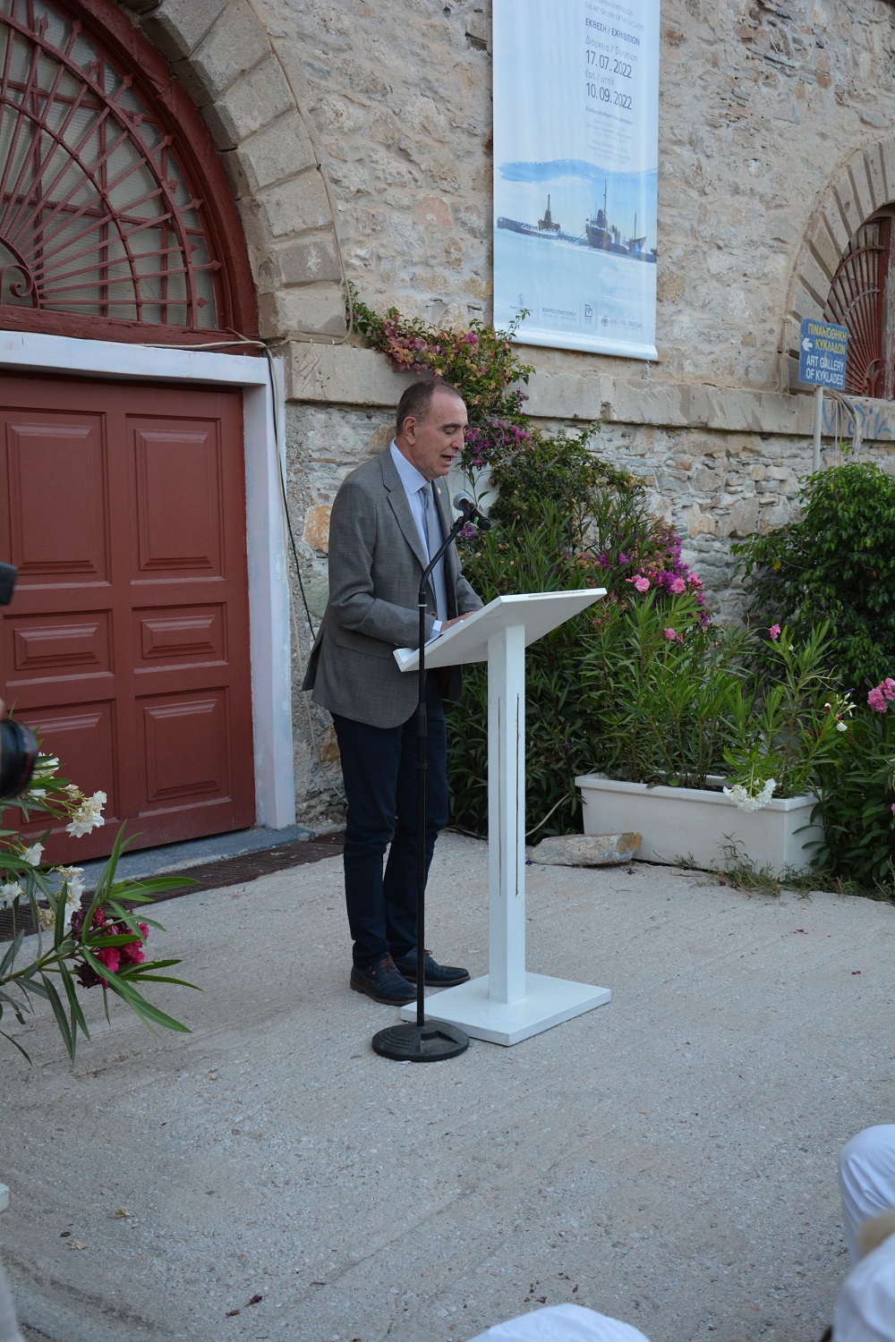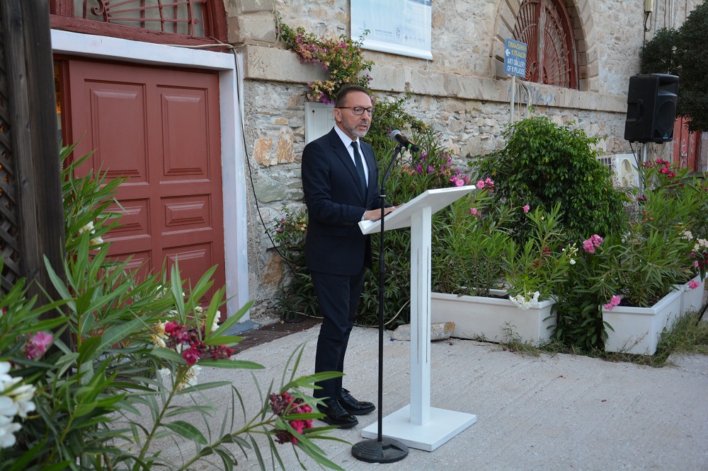 Τα εγκαίνια της έκθεσης και την ομιλία του κ. Στουρνάρα, προλόγισαν η Αντιδήμαρχος Πολιτισμού κα Αλίκη Λεονταρίτη και ο δήμαρχος Δήμου Σύρου - Ερμούπολης κ. Νίκος Λειβαδάρας. Ο διοικητής της ΤτΕ, με τη σειρά του, μίλησε για την αρχέγονη και διαχρονική σχέση του ανθρώπου με τη θάλασσα και για την καταλυτική επίδρασή της στην ιστορία, στην παράδοση και στην κουλτούρα των λαών που ζουν στις ακτές της, η οποία αναπόφευκτα καταγράφηκε πληθωρικά στην νεοελληνική τέχνη μέσω της θαλασσογραφίας. Όπως είπε: “Εξαιρετικά έργα τέχνης αυτού του ζωγραφικού είδους, από τα μέσα του 19 ου αιώνα ως τη σύγχρονη εποχή, ανήκουν στη συλλογή της ΤτΕ και τα πιο αντιπροσωπευτικά από αυτά παρουσιάζονται εδώ αναδεικνύοντας έτσι τις διαφορετικές εικόνες της θάλασσας που συγκίνησαν και συγκινούν δημιουργούς και θεατές όλων των εποχών. Είναι ιδιαίτερη η χαρά που οι “Θαλασσογραφίες” ταξιδεύουν στη Σύρο, τόπο με πολλή πλούσια ιστορία, πολιτιστική κληρονομιά αλλά και σύγχρονη δράση. Ακόμα, είμαστε χαρούμενοι που φιλοξενούνται στην Πινακοθήκη Κυκλάδων, τμήμα του ιστορικού αρχιτεκτονήματος όπου στις αρχές της πορείας του ελληνικού κράτους λειτούργησαν αποθήκες διαμετακομίσεως για την εμπορική δραστηριότητα στο σημαντικό αυτό λιμάνι, καθιστώντας το πηγή οικονομικής ανάπτυξης και πολιτιστικής κίνησης”.