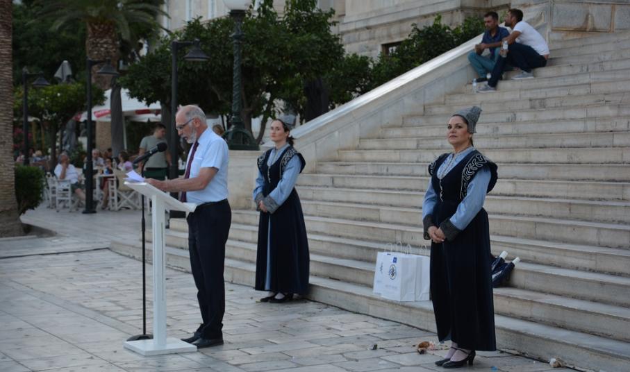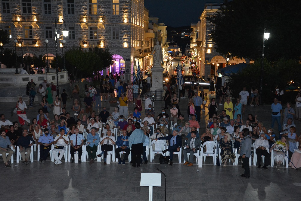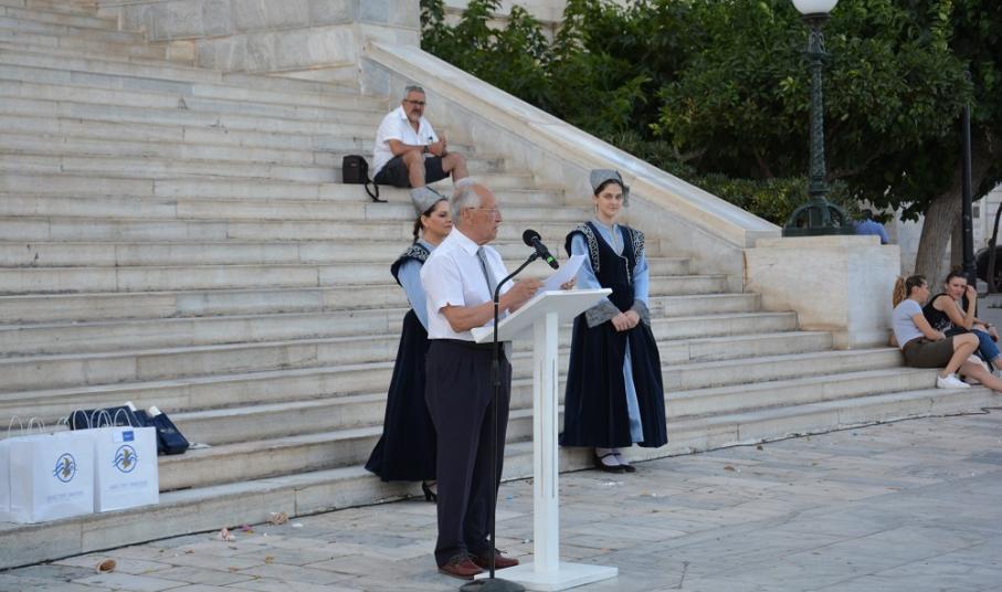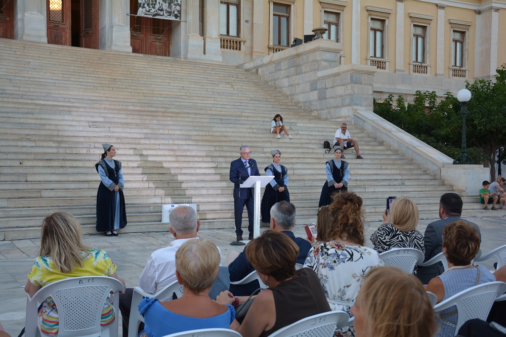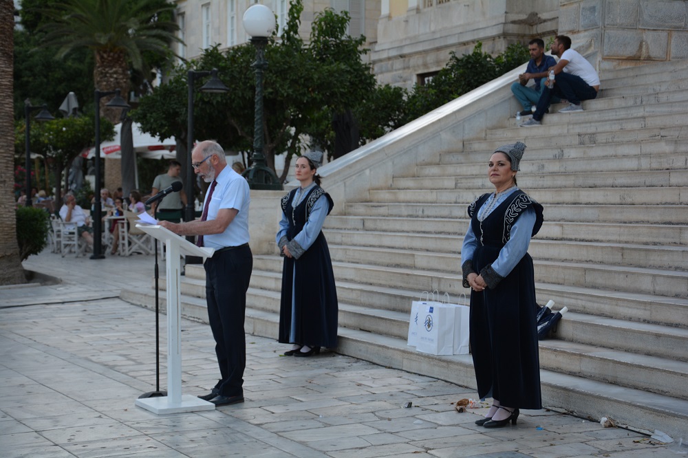 Νωρίς το βράδυ, στην πλατεία Μιαούλη, μπροστά στο Δημαρχιακό Μέγαρο, ξεκίνησε η επίσημη εκδήλωση παρουσία τοπικών αρχών, εκπροσώπων φορέων, κατοίκων κι επισκεπτών του νησιού. Η κα. Λεονταρίτη προλόγισε την εκδήλωση, κάνοντας μια σύντομη αναφορά στο περιεχόμενο και στην ουσία της έκθεσης, ευχαριστώντας όλους τους διοργανωτές και στη συνέχεια κάλεσε στο βήμα τον Γ.Γ. Απόδημου Ελληνισμού και Δημόσιας Διπλωματίας του υπουργείου Εξωτερικών, κ. Γιάννη Χρυσουλάκη. “Αυτό το ιστιοφόρο, το φορτωμένο ιστορία και μνήμη, επιτρέψτε μου να το παραλληλίσω με τους Έλληνες της διασποράς μας, που έχοντας στο νου και στην καρδιά την πατρίδα, τις ρίζες, την γλώσσα, τη μνήμη, την ιστορία, την παράδοση ως πολύτιμο φορτίο αναζήτησαν στο πέρασμα των χρόνων και σε άλλους τόπους, νέους ορίζοντες και λιμάνια. Τα πανιά του μοιάζουν με το ελεύθερο, διαρκώς ανήσυχο, διαρκώς σε αναζήτηση, ελληνικό πνεύμα που ανέκαθεν χαρακτήριζε το λαό μας” είπε στο τέλος της ομιλίας του ο κύριος Χρυσουλάκης.