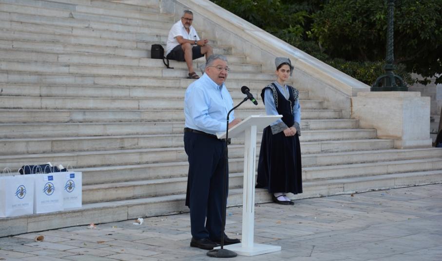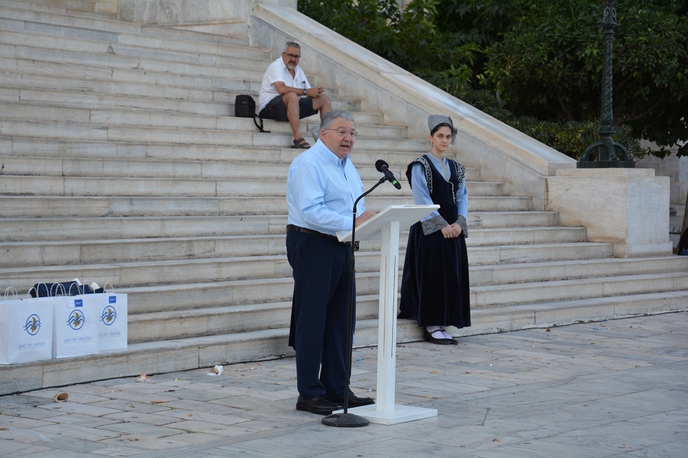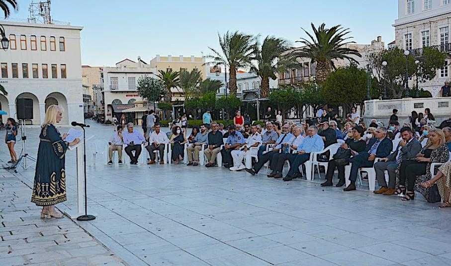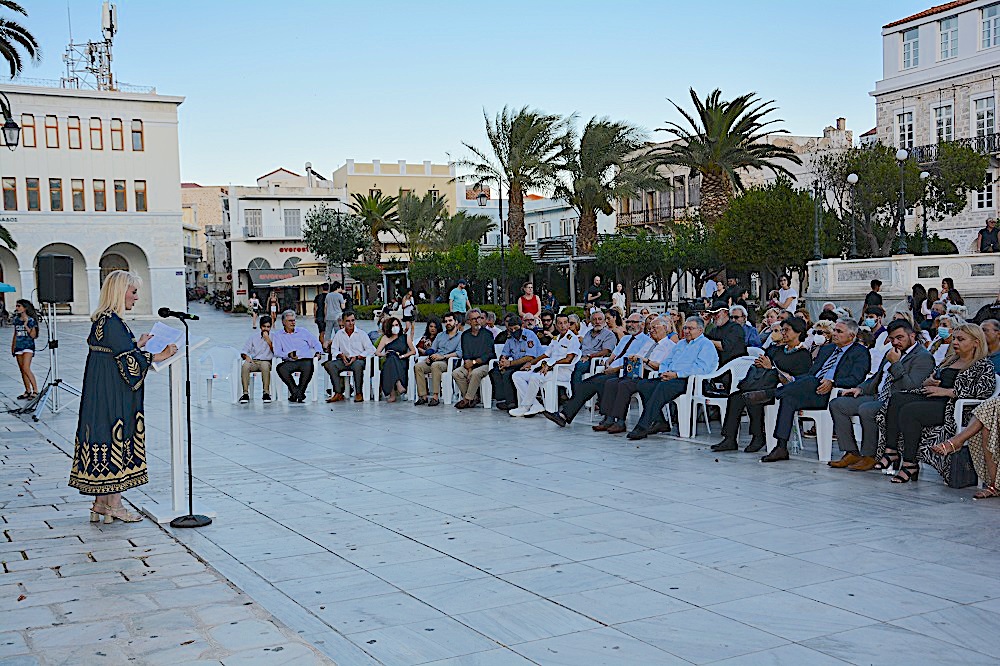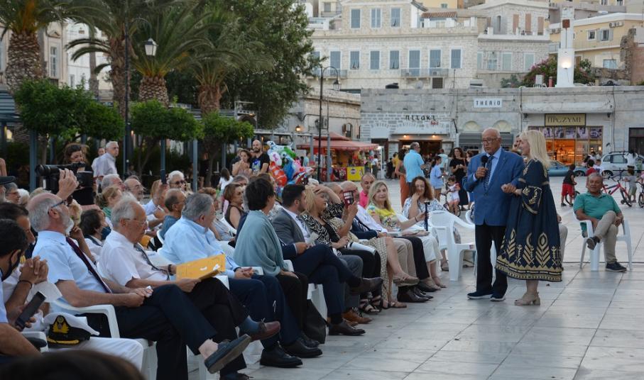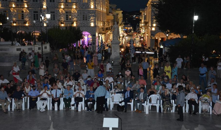 Νωρίς το βράδυ, στην πλατεία Μιαούλη, μπροστά στο Δημαρχιακό Μέγαρο, ξεκίνησε η επίσημη εκδήλωση παρουσία τοπικών αρχών, εκπροσώπων φορέων, κατοίκων κι επισκεπτών του νησιού. Η κα. Λεονταρίτη προλόγισε την εκδήλωση, κάνοντας μια σύντομη αναφορά στο περιεχόμενο και στην ουσία της έκθεσης, ευχαριστώντας όλους τους διοργανωτές και στη συνέχεια κάλεσε στο βήμα τον Γ.Γ. Απόδημου Ελληνισμού και Δημόσιας Διπλωματίας του υπουργείου Εξωτερικών, κ. Γιάννη Χρυσουλάκη. “Αυτό το ιστιοφόρο, το φορτωμένο ιστορία και μνήμη, επιτρέψτε μου να το παραλληλίσω με τους Έλληνες της διασποράς μας, που έχοντας στο νου και στην καρδιά την πατρίδα, τις ρίζες, την γλώσσα, τη μνήμη, την ιστορία, την παράδοση ως πολύτιμο φορτίο αναζήτησαν στο πέρασμα των χρόνων και σε άλλους τόπους, νέους ορίζοντες και λιμάνια. Τα πανιά του μοιάζουν με το ελεύθερο, διαρκώς ανήσυχο, διαρκώς σε αναζήτηση, ελληνικό πνεύμα που ανέκαθεν χαρακτήριζε το λαό μας” είπε στο τέλος της ομιλίας του ο κύριος Χρυσουλάκης.