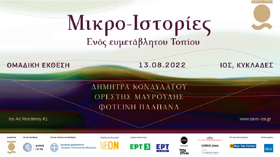 Το Σωματείο “Σώστε Την Ίο” (Save Ios), η δραστήρια κίνηση πολιτών για την προστασία του φυσικού περιβάλλοντος, των παραδοσιακών οικισμών και μνημείων της Ίου, πραγματοποιεί από τις 13 Αυγούστου έως τις 13 Σεπτεμβρίου 2022, την ομαδική έκθεση σύγχρονης τέχνης με τίτλο “Μικρο-ιστορίες ενός ευμετάβλητου τοπίου”, σε επιμέλεια του Δήμητρη Φουτρή, με νέα έργα που δημιούργησαν τρεις εικαστικοί, η Δήμητρα Κονδυλάτου, ο Ορέστης Μαυρουδής και η Φωτεινή Παλπάνα, στο πλαίσιο της συμμετοχής τους στο Ios Art Residency #1. Η έκθεση πραγματοποιείται με την υποστήριξη του Δήμου Ιητών, υπό την αιγίδα και την υποστήριξη του Υπουργείου Πολιτισμού και Αθλητισμού, και με την υποστήριξη του Οργανισμού Πολιτισμού και Ανάπτυξης ΝΕΟΝ.