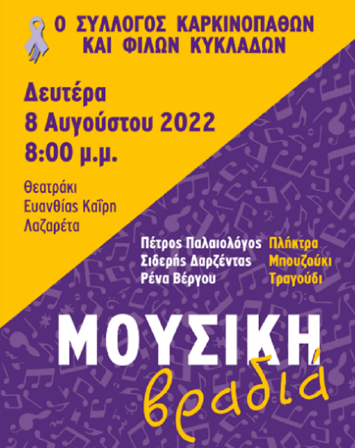Ο Σύλλογος Καρκινοπαθών και φίλων Κυκλάδων προσκαλεί τα μέλη του για μία όμορφη Αυγουστιάτικη βραδιά, τη Δευτέρα 08 Αυγούστου και ώρα 20:00΄, στον πολύ όμορφο χώρο του Θεάτρου Ευανθίας Καίρη, στα Λαζαρέττα.