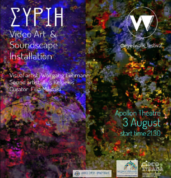Το Eye’s Walk Digital Festival, το οποίο ξεκίνησε από τη Σύρο, είναι ένα φεστιβάλ που αναπτύσσεται και κινείται με πολλή ορμή γύρω από τις ψηφιακές τεχνολογίες και την ψηφιακή τέχνη. Σε αυτήν την παραγωγή, μας παρουσιάζει ένα video art πάνω στην πρόσοψη του θεάτρου Απόλλων με την ταυτόχρονη δημιουργία ενός πρωτότυπου ηχοτοπίου από δύο καλλιτέχνες οι οποίοι δεν έχουν συναντηθεί ως τώρα. Το φεστιβάλ αποτέλεσε τον πρεσβευτή αυτής της ιδέας κι τους έφερε σε επικοινωνία για πρώτη φορά. Στη συνέχεια, ο καθένας δημιούργησε μόνος έχοντας ωστόσο κοινό στόχο. “Ένας από τους ρόλους του φεστιβάλ είναι να φέρνει κοντά ανθρώπους και να δημιουργεί συμπράξεις με διαφορετικούς καλλιτέχνες. Ο Wolfgang, πιο κοντά σε έναν οπτικό ιμπρεσιονισμό, πλάθει μια οργιαστική Φύση, από μαγικά χόρτα και φυτά. Αφήνει το μυαλό σε ψυχεδελικά οράματα, να συναντηθεί με τις Βαλκυρίες -γυναικείες θεότητες, κρυμμένες πίσω από τις φυλλωσιές, πριν τη μάχη, ήρεμες και θηλυκές.