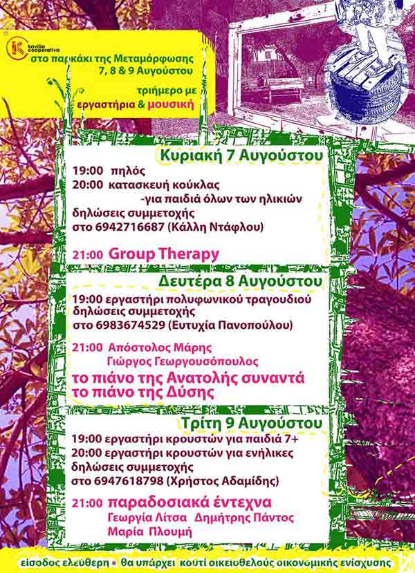 Ένα τριήμερο σεμιναρίων και μουσικής διοργανώνει η πάντα δραστήρια ομάδα Kavillia Cooperativa από τις 7 μέχρι και τις 9 Αυγούστου στο Κηπάριο της Μεταμόρφωσης .
