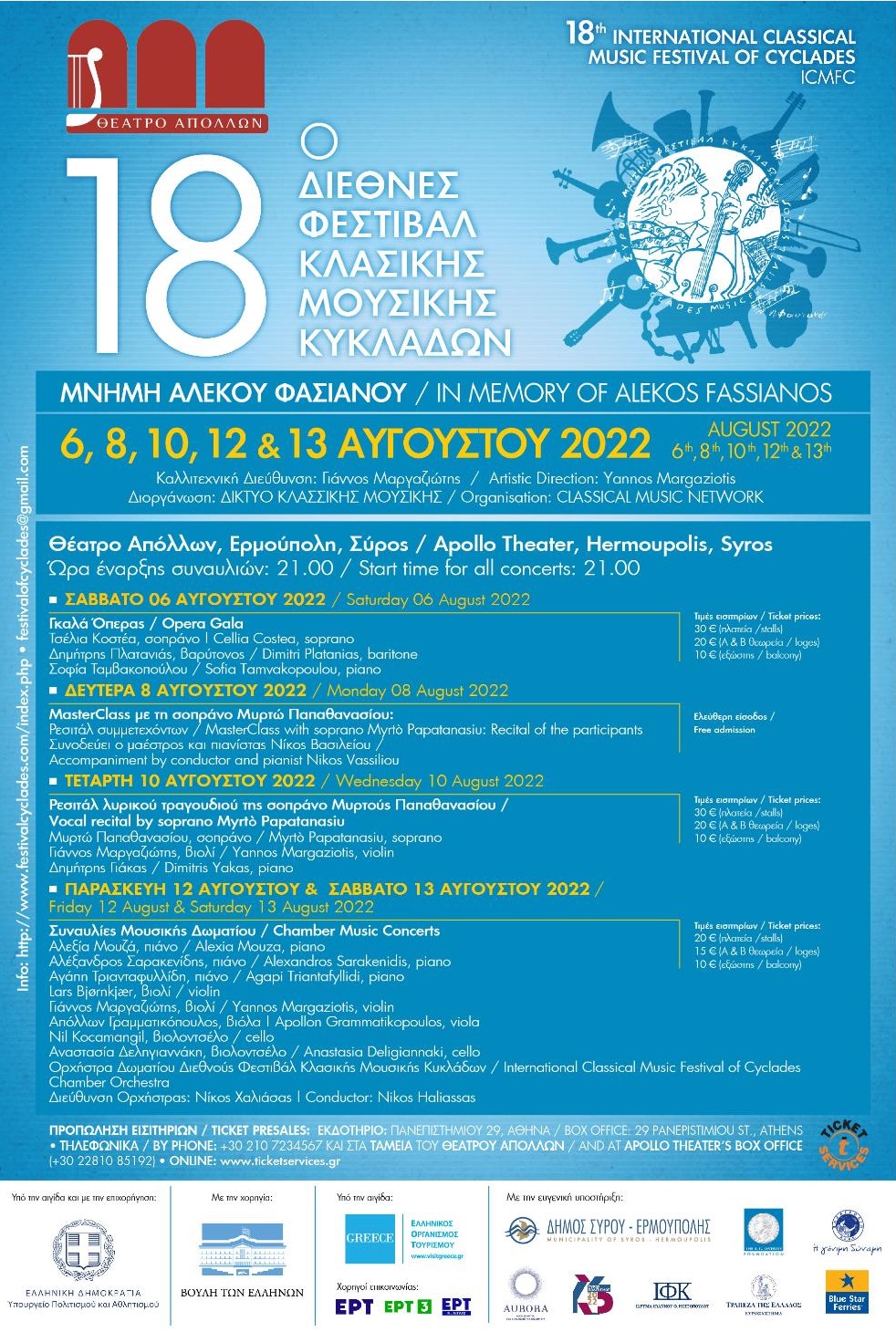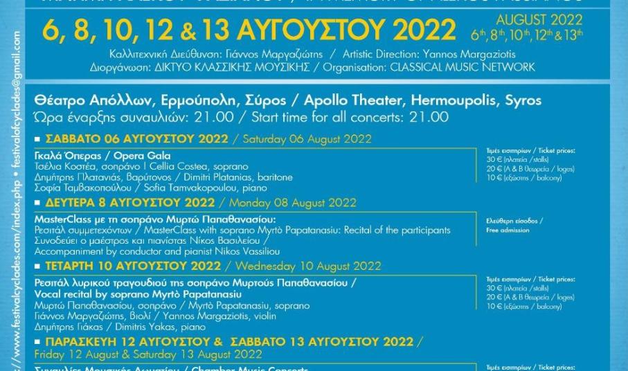 Μετά από τις δύο τελευταίες διοργανώσεις του που πραγματοποιήθηκαν σε ανοικτούς χώρους λόγω της πανδημίας, το Φεστιβάλ επιστρέφει στο «σπίτι» του, στο εμβληματικό Θέατρο Απόλλων της Ερμούπολης παρουσιάζοντας ένα γκαλά όπερας με την εξαίρετη πρωταγωνίστρια της Εθνικής Λυρικής Σκηνής Τσέλια Κοστέα και τον διεθνώς αναγνωρισμένο Έλληνα βαρύτονο Δημήτρη Πλατανιά και, δύο συναυλίες μουσικής δωματίου με σπουδαίους μουσικούς από την Ελλάδα και το εξωτερικό καθώς και ένα ρεσιτάλ λυρικού τραγουδιού με τη διεθνή ντίβα της όπερας Μυρτώ Παπαθανασίου, η οποία στο πλαίσιο του Φεστιβάλ θα παραδώσει Masterclass λυρικού τραγουδιού στο Πνευματικό Κέντρο του Δήμου Ερμούπολης, από την Παρασκευή 5 Αυγούστου έως και τη Δευτέρα 8 Αυγούστου 2022, οι συμμετέχοντες του οποίου θα εμφανιστούν σε ξεχωριστό ρεσιτάλ στη σκηνή του Θεάτρου Απόλλων.
