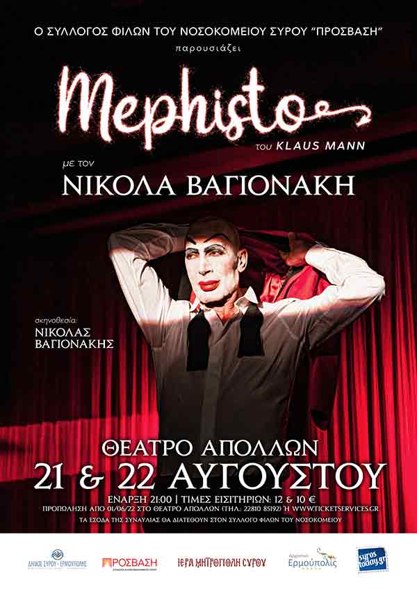 Την Κυριακή 21 και τη Δευτέρα 22 Αυγούστου, φέρνει την παράσταση Mephisto, που παρουσιάστηκε το χειμώνα στο Ίδρυμα Μιχάλης Κακογιάννης, στο θέατρο Απόλλων.