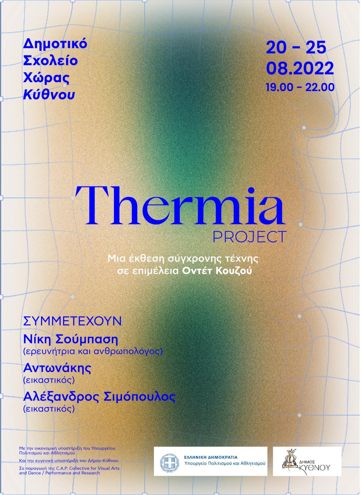 Το πρόγραμμα φιλοξενίας καλλιτεχνών “Thermia Project”, σε επιμέλεια της Οντέτ Κουζού, πραγματοποιήθηκε για πρώτη φορά φέτος στην Κύθνο ή αλλιώς Θερμιά, όπως την αποκαλούν οι ντόπιοι, θέλοντας να αποτελέσει έναν φορέα σύγχρονης τέχνης στο νησί. Δίνει προτεραιότητα στην πραγματοποίηση ενός συνόλου δράσεων, με στόχο τόσο την καλλιτεχνική έρευνα όσο και την αλληλεπίδραση των κατοίκων και των επισκεπτών του νησιού με τη σύγχρονη τέχνη ενώ παράλληλα επιθυμεί να εμπλακεί με την τοπική κοινωνία και να δημιουργήσει ερεθίσματα μαζί της.