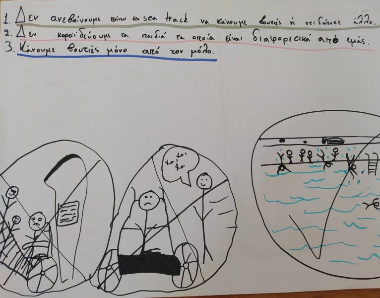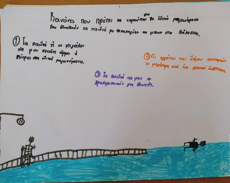“Μας επισκέφθηκαν και η Άννα Κουρκουμάρη με τον Κώστα και η Κατερίνα Μαραγκού με την Μαρία. Ο Κώστας και η Μαρία είναι δύο εξαιρετικά πλάσματα που χρησιμοποιούν αναπηρικό αμαξίδιο και οι υπέροχες μαμάδες τους μίλησαν στα παιδιά εξηγώντας τους ότι, για να μπορούν τα άτομα με ειδικές ανάγκες να χαρούν τη θάλασσα, χρειάζονται αυτό το μηχάνημα να λειτουργεί σωστά και να μη χαλάει συνέχεια” είπε η Διευθύντρια του σχολείου και συνέχισε περνώντας τα δικά της μηνύματα: “Στα παιδιά, ξεκινώντας, μίλησα κι εγώ λέγοντας πως είναι σημαντικό όλοι να λειτουργούμε ως μαχητές του καλού, να γίνουμε πρεσβευτές αυτής της αλλαγής και να μάθουμε στους μεγάλους πώς πρέπει να φέρονται, τι δεν πρέπει να κάνουν και να βοηθάμε. Δεν ξέρω αν τα παιδιά είχαν καταλάβει το λόγο που βρίσκονται αυτές οι κατασκευές εκεί και αν τους είχαν μιλήσει οι γονείς. Όταν κατάλαβαν όμως τη σπουδαιότητά τους, έδειξαν σεβασμό”.