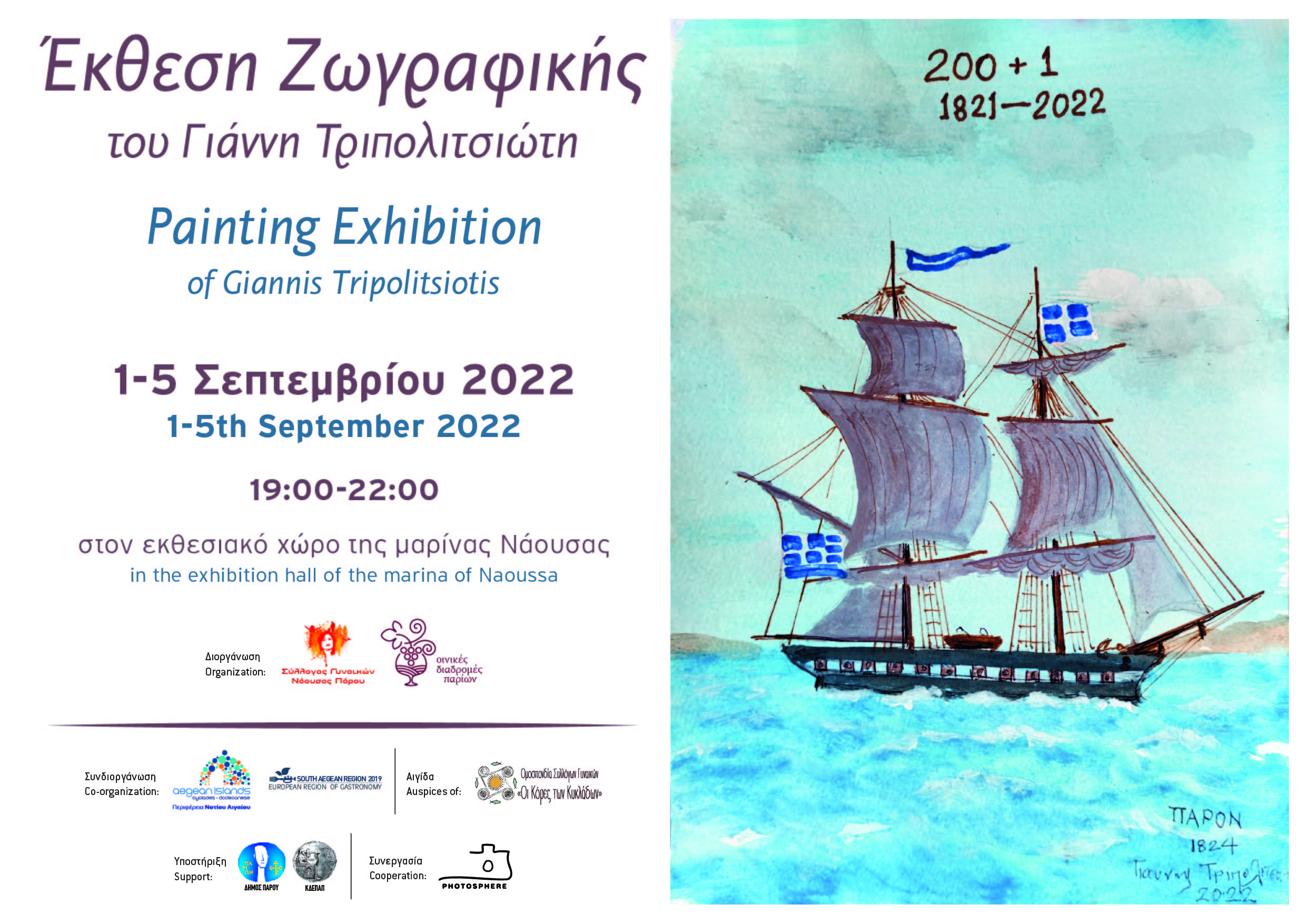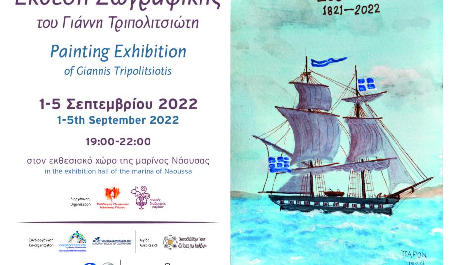 -Διοργάνωση έκθεσης ζωγραφικής με έργα του εικαστικού κυρίου Γιάννη Τριπολιτσιώτη με τίτλο «200+1», στο χώρο της αίθουσας της μαρίνας Νάουσας. Διάρκεια έκθεσης από 1 έως και 5 Σεπτεμβρίου 2022 και ώρες 19:00-22:00. Εγκαίνια την Πέμπτη 1 Σεπτεμβρίου στις 19:00.