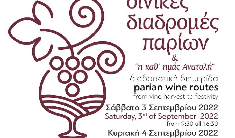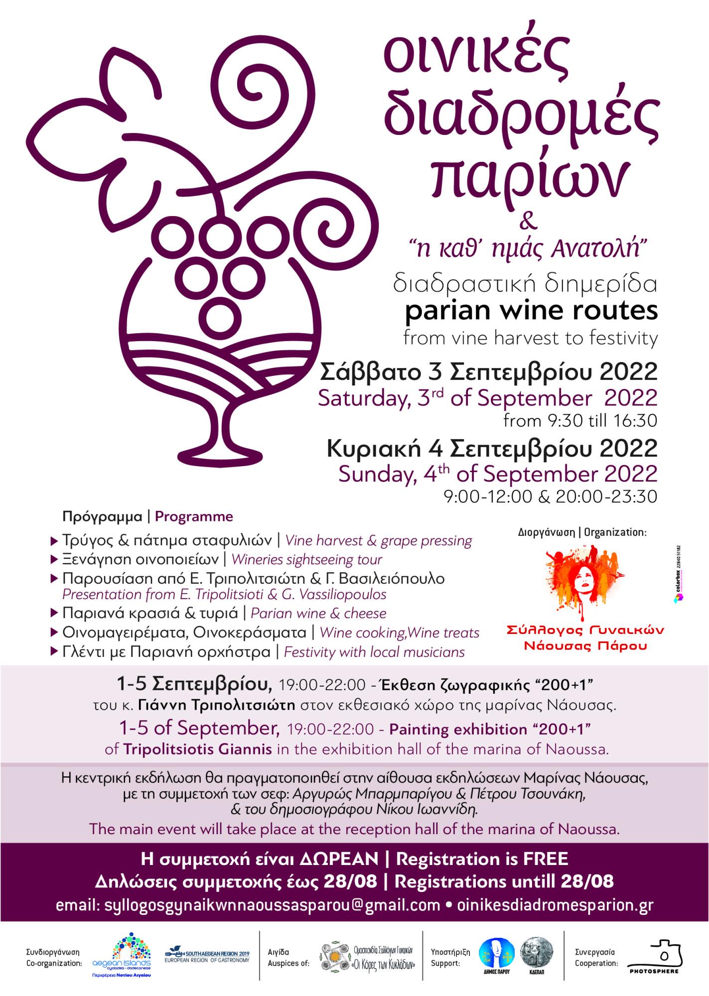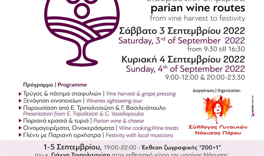 O Σύλλογος Γυναικών Νάουσας Πάρου σε συνδιοργάνωση με την Περιφέρεια Νοτίου Αιγαίου, την υποστήριξη του Δήμου Πάρου και της ΚΔΕΠΑΠ, υπό την αιγίδα της Ομοσπονδίας Συλλόγων Γυναικών «Οι Κόρες των Κυκλάδων», την τιμητική συμμετοχή του εικαστικού κυρίου Γιάννη Τριπολιτσιώτη, τη δημιουργική συνεργασία και συνύπαρξη με το φεστιβάλ φωτογραφίας ανοικτού χώρου «Photosphere», αλλά και σε συνεργασία με τους σεφ κυρία Αργυρώ Μπαρμπαρήγου και κύριο Πέτρο Τσουνάκη, και το δημοσιογράφο της ΕΡΤ και του «Grape» κύριο Νίκο Ιωαννίδη, και φυσικά, τα επίσημα Οινοποιεία της Πάρου, και Ναουσαίους μικροοινοπαραγωγούς, διοργανώνει το Σάββατο 3 και την Κυριακή 4 Σεπτεμβρίου 2022 για τέταρτη χρονιά, διαδραστική διημερίδα με τον τίτλο: «OINIKEΣ ΔΙΑΔΡΟΜΕΣ ΠΑΡΙΩΝ»
