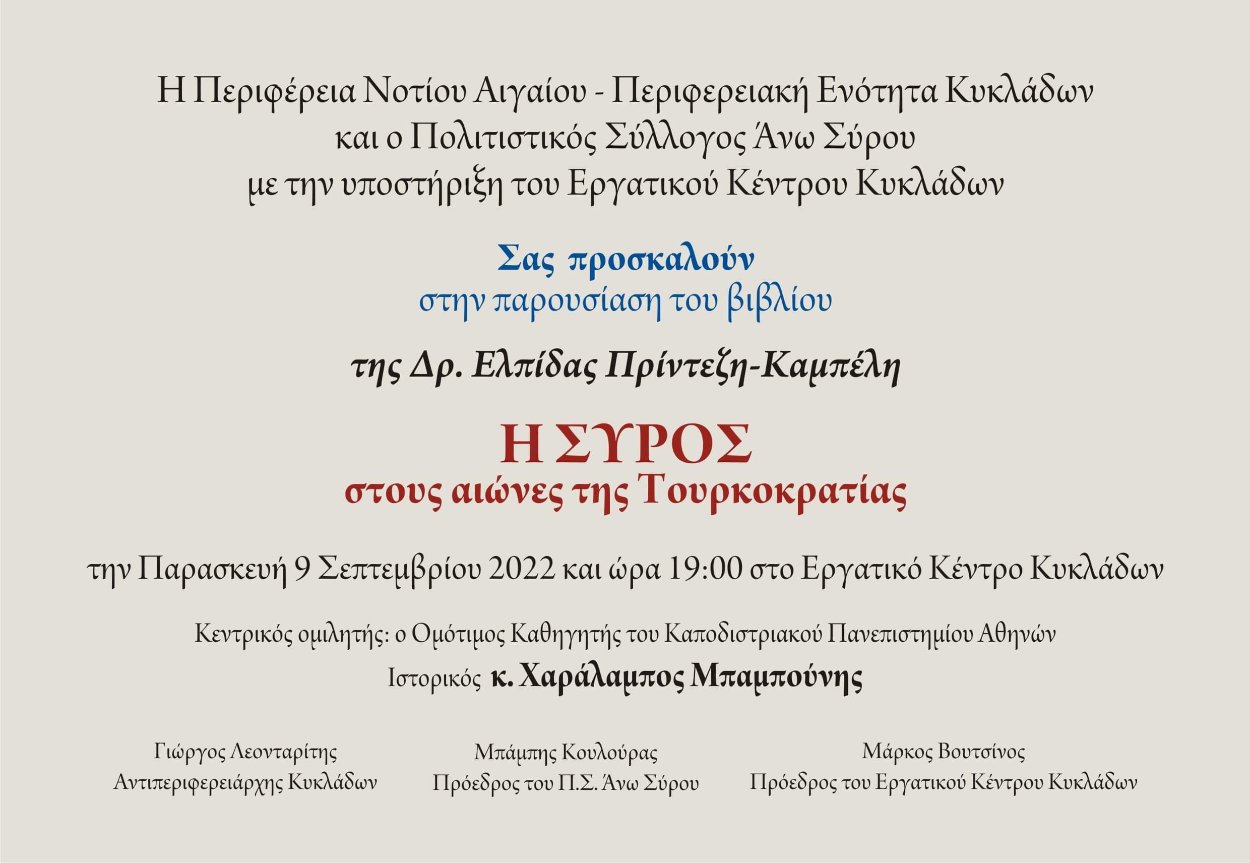 Η Περιφέρεια Νοτίου Αιγαίου - Περιφερειακή Ενότητα Κυκλάδων και ο Πολιτιστικός Σύλλογος Άνω Σύρου με την υποστήριξη του Εργατικού Κέντρου Κυκλάδων σας προσκαλούν στην παρουσίαση του βιβλίου της Δρ. Ελπίδας Πρίντεζη-Καμπέλη «Η Σύρος στους αιώνες της Τουρκοκρατίας» την Παρασκευή 9 Σεπτεμβρίου 2022 και ώρα 19:00 στο Εργατικό Κέντρο Κυκλάδων.