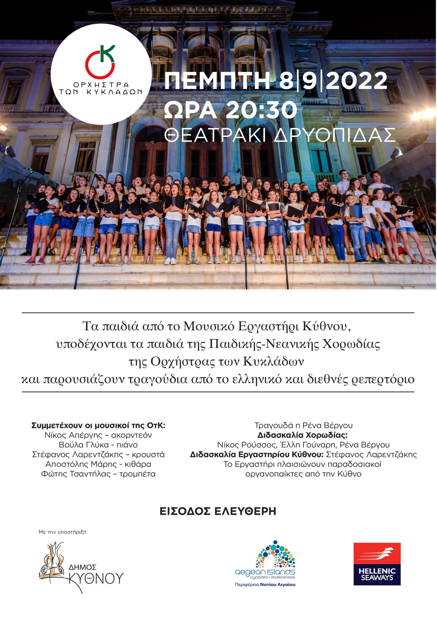 Τα παιδιά από το Μουσικό Εργαστήρι Κύθνου, υποδέχονται τα παιδιά της Παιδικής-Νεανικής Χορωδίας της Ορχήστρας των Κυκλάδων και παρουσιάζουν τραγούδια από το ελληνικό και διεθνές ρεπερτόριο.