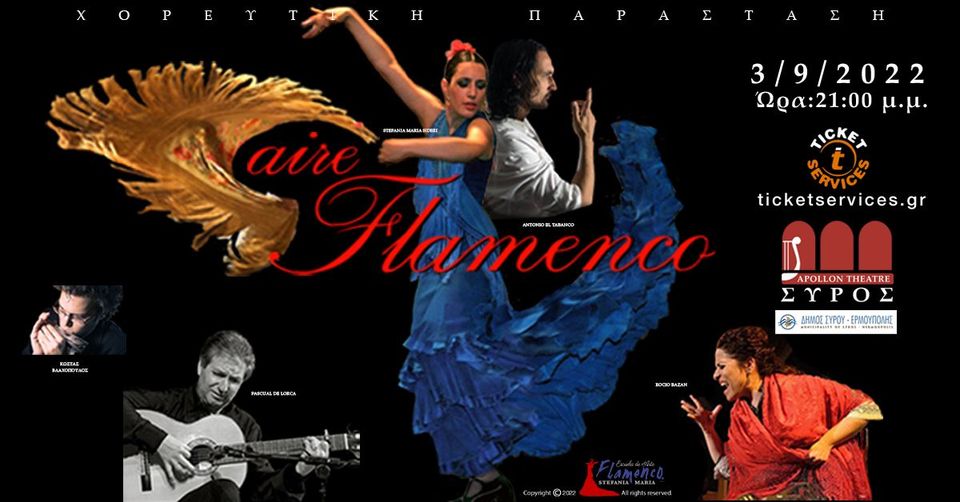 Φλαμένκο στην πιο αυθεντική του μορφή θα έχουν την ευκαιρία να απολαύσουν όσοι βρεθούν το Σάββατο 3 Σεπτεμβρίου στις 21.00 στο θέατρο Απόλλων της Σύρου. Μια αυθεντική παράσταση φλαμένκο, της χορεύτριας και χορογράφου Στεφανίας Μαρίας Σιδέρη, πλαισιωμένη από μεγάλα ονόματα του είδους όπως Pascual de Lorca, Antonio el Tabanco και Rocio Bazan, μια παράσταση που ταξιδεύει στη ρίζα του φλαμένκο και αποκαλύπτει την ουσία, το πάθος, το μυστικισμό του και την βαθιά σχέση μουσικής- φωνής και κίνησης.