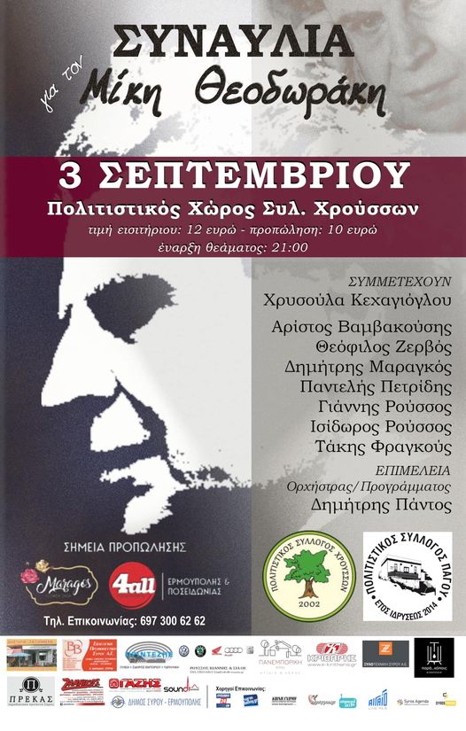 Ο Πολιτιστικός Σύλλογος Χρούσσων και ο Πολιτιστικός Σύλλογος Πάγου, με αφορμή την επέτειο θανάτου του σπουδαίου Έλληνα συνθέτη, συνδιοργανώνουν μια συναυλία - αφιέρωμα στο Μίκη Θεοδωράκη, το Σάββατο 3 Σεπτεμβρίου 2022 στις 21.00. Συμμετέχουν οι μουσικοί: Χρυσούλα Κεχαγιόγλου, Αριστος Βαμβακούσης, Θεόφιλος Ζερβός, Δημήτρης Μαραγκός, Παντελής Πετρίδης, Γιάννης Ρούσσος, Ισίδωρος Ρούσσος, Τάκης Φραγκούς. Επιμέλεια προγράμματος: Δημήτρης Πάντος.