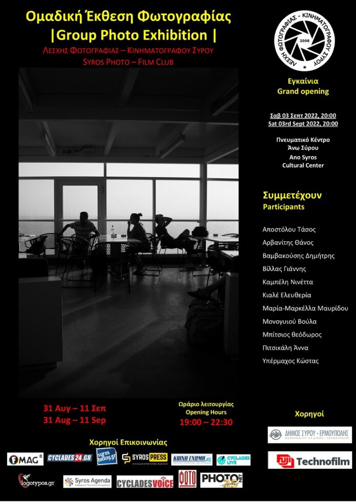 Στο Πνευματικό Κέντρο Άνω Σύρου, το Σάββατο 3 Σεπτεμβρίου, η Λέσχη Φωτογραφίας Σύρου πραγματοποιεί τα εγκαίνια της ομαδικής έκθεσης των μελών της με έργα των: Αποστόλου Τάσος, Αρβανίτης Θάνος, Βαμβακούσης Δημήτρης, Βίλλας Γιάννης, Καμπέλη Νινέττα, Κιαλέ Ελευθερία, Μαρία-Μαρκέλλα Μαυρίδου, Μονογυιού Βούλα, Μπίτσιος θεόδωρος, Πιτσικάλη Άννα, Υπέρμαχος Κώστας. Ώρες λειτουργίας έκθεσης: Καθημερινά 19:00 – 22:00