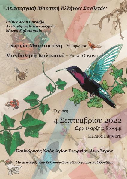 Την Κυριακή 4 Σεπτεμβρίου 2022 και ώρα 8 μ.μ., στον Καθεδρικό Ναό Αγίου Γεωργίου Άνω Σύρου και με τη στήριξη του Συλλόγου Φίλων Εκκλησιαστικού Οργάνου, η υψίφωνος Γεωργία Μπαλαμπίνη και η οργανίστα-μουσικολόγος Μαγδαληνή Καλοπανά παρουσιάζουν λειτουργική μουσική Ελλήνων συνθετών: Marco Sofianopulo, Αλέξανδρος Κατακουζηνός, Prince Jean Caradja, με κάποια από τα έργα να εκτελούνται για πρώτη φορά. To μουσικό υλικό προέρχεται από το Αρχείο Ελλήνων Μουσουργών Θωμά Ταμβάκου (Α.Ε.Μ.Θ.Τ.) και από Αρχείο Ελληνικής Μουσικής του Τμήματος Μουσικών Σπουδών ΕΚΠΑ «Πολύμνια».
