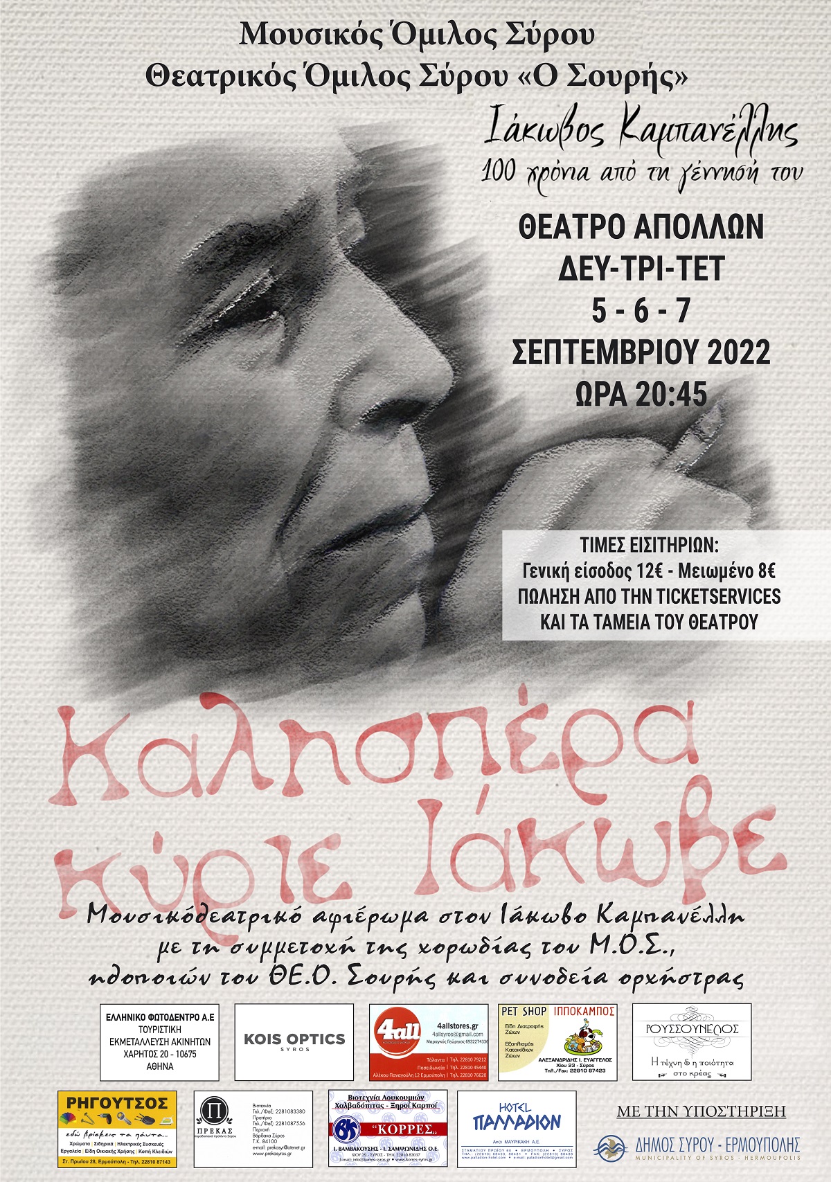 Το Υπουργείο Πολιτισμού έχει ανακηρύξει επίσημα το έτος 2022 ως έτος αφιερωμένο στον Ιάκωβο Καμπανέλλη. Με αφορμή τη συμπλήρωση των εκατό χρόνων από τη γέννησή του και των δέκα χρόνων από το θάνατό του, ο Μουσικός Όμιλος Σύρου, σε συνεργασία με τον Θεατρικό Όμιλο "Ο ΣΟΥΡΗΣ" διοργανώνουν μια μουσικοθεατρική παράσταση με τίτλο «Καλησπέρα, Κύριε Ιάκωβε», διανθισμένη με δρώμενα από θεατρικά έργα και τραγούδια σε στίχους του Ι. Καμπανέλλη. Λίγο πριν την πρεμιέρα της παράστασης, ο πρόεδρος του Μουσικού Ομίλου Σύρου, Γιάννης Αργυρίου, μίλησε στην “Κοινή Γνώμη” για την ιδιαίτερη αυτή παράσταση.