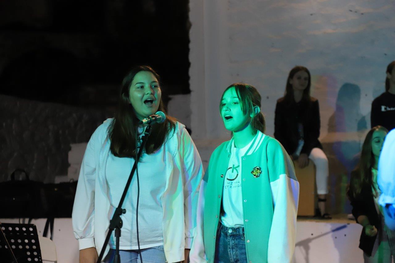 Τη σκυτάλη πήραν τα παιδιά της Παιδικής-Νεανικής Χορωδίας της Ορχήστρας των Κυκλάδων τα οποία με τη συνοδεία πιάνου, κιθάρας, ακορντεόν και τρομπέτας παρουσίασαν ένα επιλεγμένο πρόγραμμα με παιδιά από το Προπαρασκευαστικό, Παιδικό και Νεανικό Τμήμα.