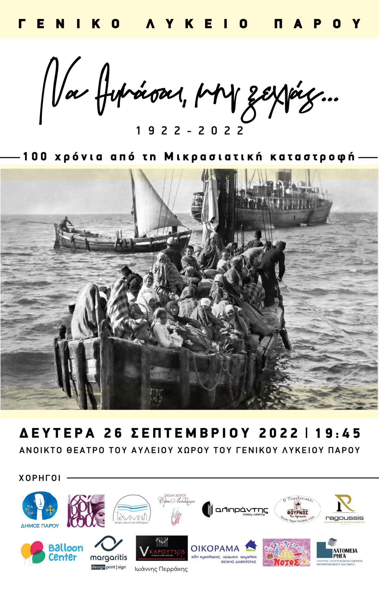 Εκδήλωση για τα 100 χρόνια από την Μικρασιατική Καταστροφή οργανώνει το Γενικό Λύκειο Πάρου τη Δευτέρα 26 Σεπτεμβρίου στο Ανοικτό Θέατρο του αύλειου χώρου του Γενικού Λυκείου Πάρου.