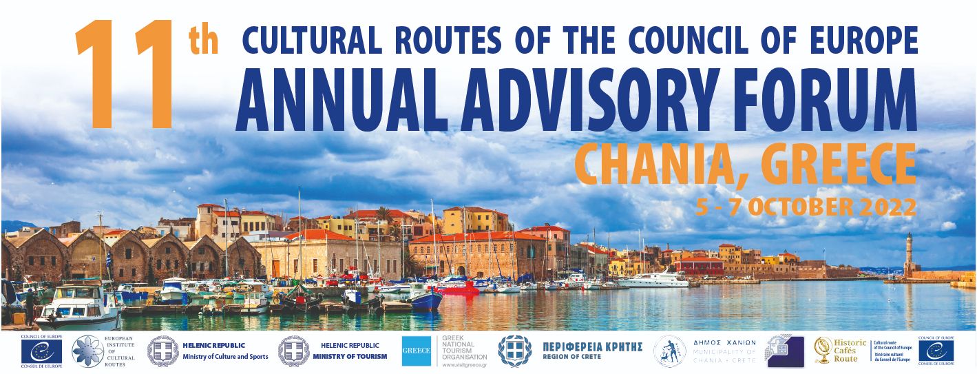 Το 11ο Ετήσιο Συμβουλευτικό Forum Πολιτιστικών Διαδρομών του Συμβουλίου της Ευρώπης (ΣτΕ) θα πραγματοποιηθεί στις 5 - 7 Οκτωβρίου 2022 στα Χανιά και αποτελεί συνδιοργάνωση της “Διευρυμένης Μερικής Συμφωνίας Πολιτιστικών Διαδρομών του Συμβούλιο της Ευρώπης”, του Ευρωπαϊκού ινστιτούτου πολιτιστικών διαδρομών, του Υπουργείου Πολιτισμού και Αθλητισμού (εθνικό εστιακό σημείο του προγράμματος), του Υπουργείου Τουρισμού, του ΕΟΤ, της Περιφέρειας Κρήτης, του Δήμου Χανίων, του Εμπορικού και Βιομηχανικού Επιμελητηρίου Χανίων, καθώς και της Πολιτιστικής Διαδρομής «Δρόμος Ιστορικών Καφέ».