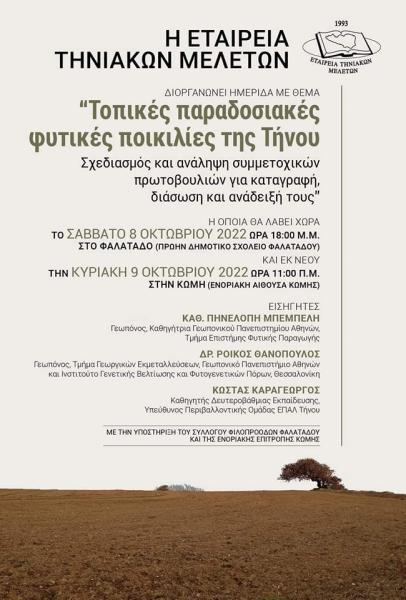 Η εταιρεία Τηνιακών Μελετών διοργανώνει ημερίδα με θέμα “Τοπικές παραδοσιακές φυτικές ποικιλίες της Τήνου”. Σχεδιασμός και ανάληψη συμμετοχικών πρωτοβουλιών για καταγραφή διάσωση και ανάδειξη τους. Η εκδήλωση θα λάβει χώρα το Σάββατο, 08 Οκτωβρίου 2022 και ώρα 18.00 στο Φαλατάδο (πρώην Δημοτικό Σχολείο) και θα επαναληφθεί την Κυριακή, 09 Οκτωβρίου 2022 και ώρα 11.00 στην Κώμη (στην Ενοριακή Αίθουσα) της Τήνου, με την υποστήριξη του Συλλόγου Φιλοπροόδων Φαλατάδου και της Ενοριακής Επιτροπής Κώμης.