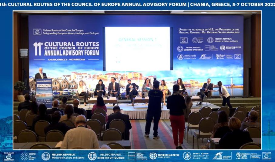 Στα Χανιά, παραβρέθηκε επίσης και η υπουργός Πολιτισμού, Λίνα Μενδώνη,η οποία δήλωσε για τη συμμετοχή της στο φόρουμ: «Είμαστε ευτυχείς που φιλοξενούμε το 11ο Φόρουμ στα Χανιά, πολύ περισσότερο επειδή συμπίπτει με την επέτειο των 35 χρόνων του θεσμού των Πολιτιστικών Διαδρομών. Ο διάλογος και ο σχεδιασμός για τη δημιουργία μιας πολιτιστικής διαδρομής, απαιτεί συνεργασίες σε επιστημονικό και διεπιστημονικό επίπεδο, αλλά και την ενεργό συμμετοχή τοπικών φορέων και κλάδων της οικονομίας, προσφέροντας ένα διαφορετικό είδος πολιτιστικής επιχειρηματικότητας, στενά συνδεδεμένης με το πολιτιστικό απόθεμα” , ενώ για τη σημασία της χώρας μας και το ρόλο της στην πολιτιστική κληρονομιά της Ευρώπης, δήλωσε: «Το δυνατό μας χαρτί είναι ο ίδιος ο πολιτισμός μας. Και πολιτισμός είναι τα πάντα. Έχουμε μια τεράστια πολιτιστική κληρονομιά και μάλιστα στη μακρά ιστορική διάρκεια. Έχουμε άυλη πολιτιστική κληρονομιά, η οποία ξεχωρίζει για την ποιότητα και την ποικιλομορφία της και έχουμε και μια σύγχρονη δημιουργία, η οποία ιδιαίτερα μετά την περίοδο της πανδημίας, παρουσιάζει πάρα πολύ μεγάλη άνθηση. Επομένως, τα τρία πλεονεκτήματα που θέλουμε για τις Πολιτιστικές Διαδρομές τα έχουμε. Από εκεί και πέρα αν όλα αυτά συνδυαστούν με ένα εξαιρετικά σημαντικό φυσικό περιβάλλον και με μια δυνατή, νέα και καινοτόμο επιχειρηματικότητα που δημιουργείται πλέον στην Ελλάδα μέσω των start ups και των επενδύσεων νομίζω ότι έχουμε όλο το φάσμα που επιτρέπει να είμαστε παρόντες, δυνατά παρόντες στις Πολιτιστικές Διαδρομές».