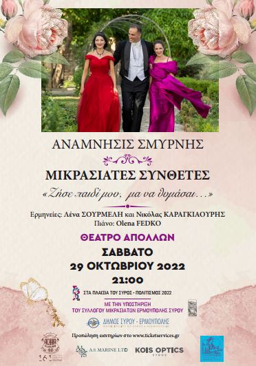 Το Σάββατο 29 Οκτωβρίου στις 21:00 στο Δημοτικό Θέατρο Ερμούπολης «Απόλλων» οι Λένα Σουρμελή, ο Νικόλας Καραγκιαούρης και η Olena Fedko παρουσιάζουν μια μοναδική παράσταση με μουσική συνθετών Μικρασιάτικης καταγωγής.