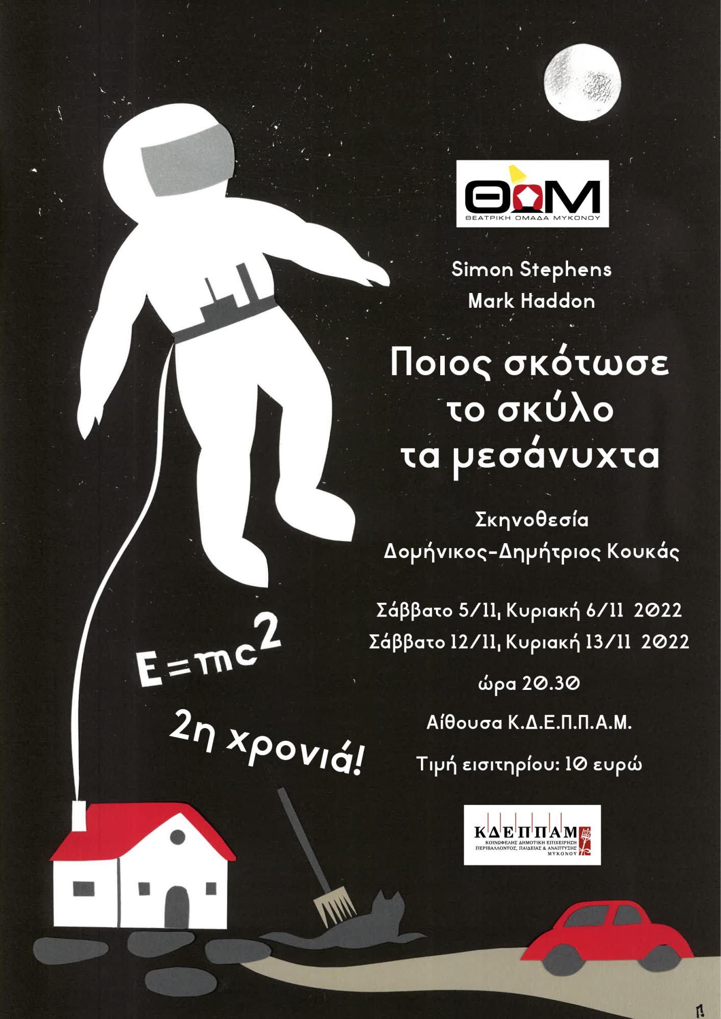 Η Θεατρική Ομάδα Μυκόνου μας παρουσιάζει για 2η χρονιά το έργο του Simon Stephens, που μιλάει για την διαφορετικότητα, “Ποιος σκότωσε το σκύλο τα μεσάνυχτα” βασισμένο στο πολυβραβευμένο μυθιστόρημα του Mark Haddo.