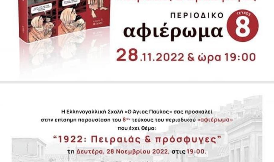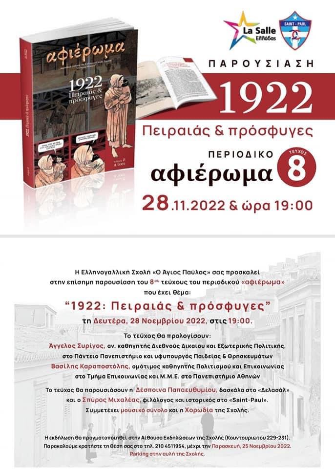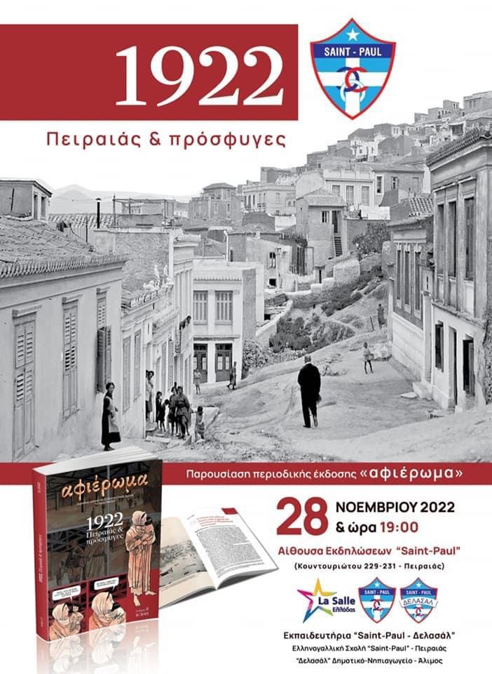 Τη Δευτέρα 22 Νοεμβρίου στις 19.00 , η Ελληνογαλλική Σχολή “Ο Άγιος Παύλος” θα παρουσιάσει το αφιέρωμα “1922: Πειραιάς και πρόσφυγες” στην αίθουσα εκδηλώσεων της Σχολής (Κουντουριώτου 229 -231, Πειραιάς). Το τεύχος θα προλογίσουν o Άγγελος Συρίγος, αναπληρωτής καθηγητής Διεθνούς Δικαίου και Εξωτερικής Πολιτικής στο Πάντειο Πανεπιστήμιο, υφυπουργός Παιδείας και Θρησκευμάτων και ο Βασίλης Καραποστόλης, ομότιμος καθηγητής Πολιτισμού και Επικοινωνίας στο τμήμα Επικοινωνίας και Μ.Μ.Ε. του Πανεπιστημίου Αθηνών. Το τεύχος θα παρουσιάσουν η Δέσποινα Παπαευθυμίου, δασκάλα στο “Δελασάλ” και ο Σπύρος- Μιχαλέας, φιλόλογος και ιστορικός στο Saint- Paul.