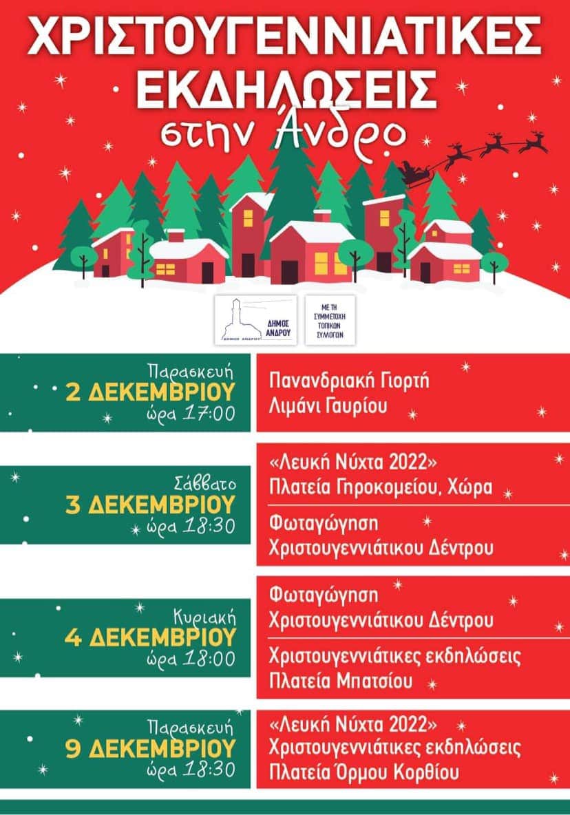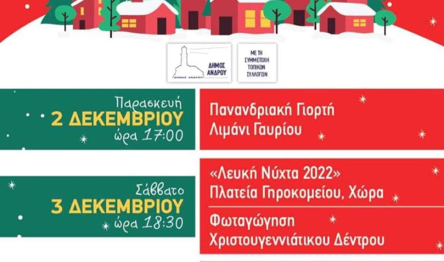 To Σάββατο 3 Δεκεμβρίου η Άνδρος διοργανώνει τη δική της “Λευκή Νύχτα” στην πλατεία Γηροκομείου ενώ στις 18.30 θα πραγματοποιηθεί η φωταγώγηση του Χριστουγεννιάτικου δέντρου της Χώρας. Την Κυριακή 4 Δεκεμβρίου στις 18.00, θα ανάψει το Χριστουγεννιάτικο δέντρο της πλατείας Μπατσίου όπου και θα ακολουθήσουν εορταστικές εκδηλώσεις. Στις 9 Δεκεμβρίου, ημέρα Παρασκευή και ώρα 18.30, η “Λευκή Νύχτα” και οι εορταστικές εκδηλώσεις “μεταφέρονται” στην πλατεία Όρμου Κορθίου, ολοκληρώνοντας των κύκλο των εορταστικών εκδηλώσεων του νησιού.