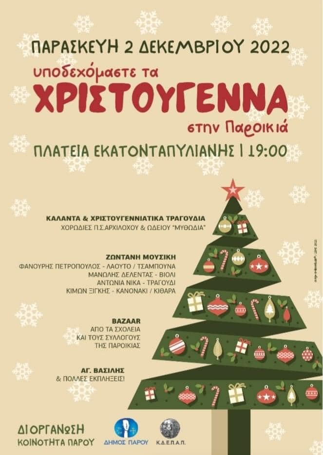 Την Παρασκευή 2 Δεκεμβρίου, στις 19.00, στην πλατεία Εκατονταπυλιανής, η Παροικιά υποδέχεται τα Χριστούγεννα με κάλαντα και Χριστουγεννιάτικα τραγούδια από τις χορωδίες Π.Σ. Αρχιλόχου και ωδείου “Μυθωδία”, ζωντανή μουσική από τετραμελή ορχήστρα, bazaar των συλλόγων και των σχολείων της Παροικιάς και τον Άγιο Βασίλη σε μία συνδιοργάνωση της κοινότητας, του Δήμου και της ΚΔΕΠΑΠ.