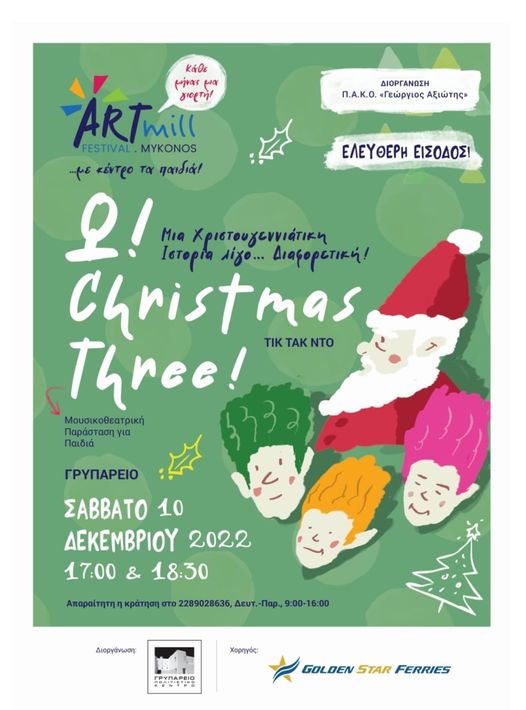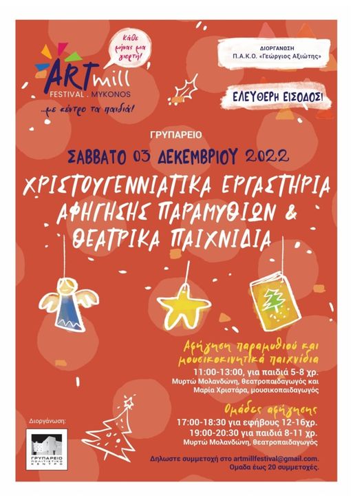 Οι Χριστουγεννιάτικες εκδηλώσεις στο Γρυπάρειο Πολιτιστικό Κέντρο Δήμου Μυκόνου ξεκίνησαν το Σάββατο 26 Νοεμβρίου με την παράσταση κουκλοθέατρου “ Ο Φον Κουραμπιές” από την ομάδα Τα Πάντα Φι, ενώ χθες Κυριακή πραγματοποιήθηκε εργαστήρι κουκλοθέατρου για παιδιά 5 έως 10 ετών. Στις 3 του Δεκέμβρη ξεκινούν τα Χριστουγεννιάτικα εργαστήρια. Το πρόγραμμα περιλαμβάνει αφήγηση παραμυθιού και θεατρικά-μουσικοκινητικά παιχνίδια στις 11 το πρωί, για παιδιά 5 έως 8 χρονών, από την Μυρτώ Μολανδώνη, θεατροπαιδαγωγό και Μαρία Χριστάρα, μουσικοπαιδαγωγό καθώς και ομάδες αφήγησης για εφήβους (17.00 -18.30) και για παιδιά 8 έως 11 ετών (19.00 – 20.30) με τη Μυρτώ Μολανδώνη, θεατροπαιδαγωγό. Στις 10 Δεκεμβρίου, με δύο παραστάσεις (έναρξη 17.00 και 18.30), η ομάδα Τικ Τακ Ντο παρουσιάζει τη μουσικοθεατρική παράσταση για παιδιά “Ω! Christmas three”, μια Χριστουγεννιάτικη ιστορία λίγο...διαφορετική!