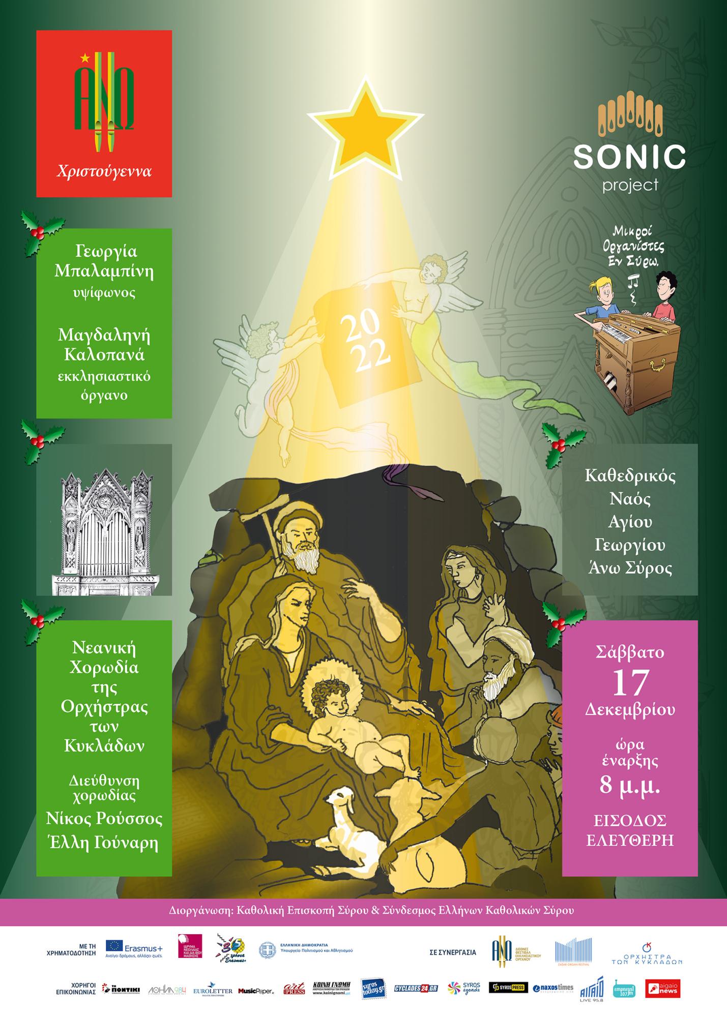Το Φεστιβάλ ΑΝΩ και οι συντελεστές της συναυλίας Γεωργία Μπαλαμπίνη (υψίφωνος), Μαγδαληνή Καλοπανά (εκκλησιαστικό όργανο) και η Νεανική Χορωδία της Ορχήστρας των Κυκλάδων με τη διεύθυνση των Νίκου Ρούσσου και Έλλης Γούναρη, προσκαλούν κατοίκους και επισκέπτες του νησιού στον μεσαιωνικό οικισμό της Άνω Σύρου με τα γραφικά στολισμένα σοκάκια και τη μοναδική φάτνη που κατασκεύασαν τα μέλη της Ενορίας του Καθεδρικού Ναού του Αγίου Γεωργίου, για μια ακόμη αξέχαστη Χριστουγεννιάτικη εμπειρία.
