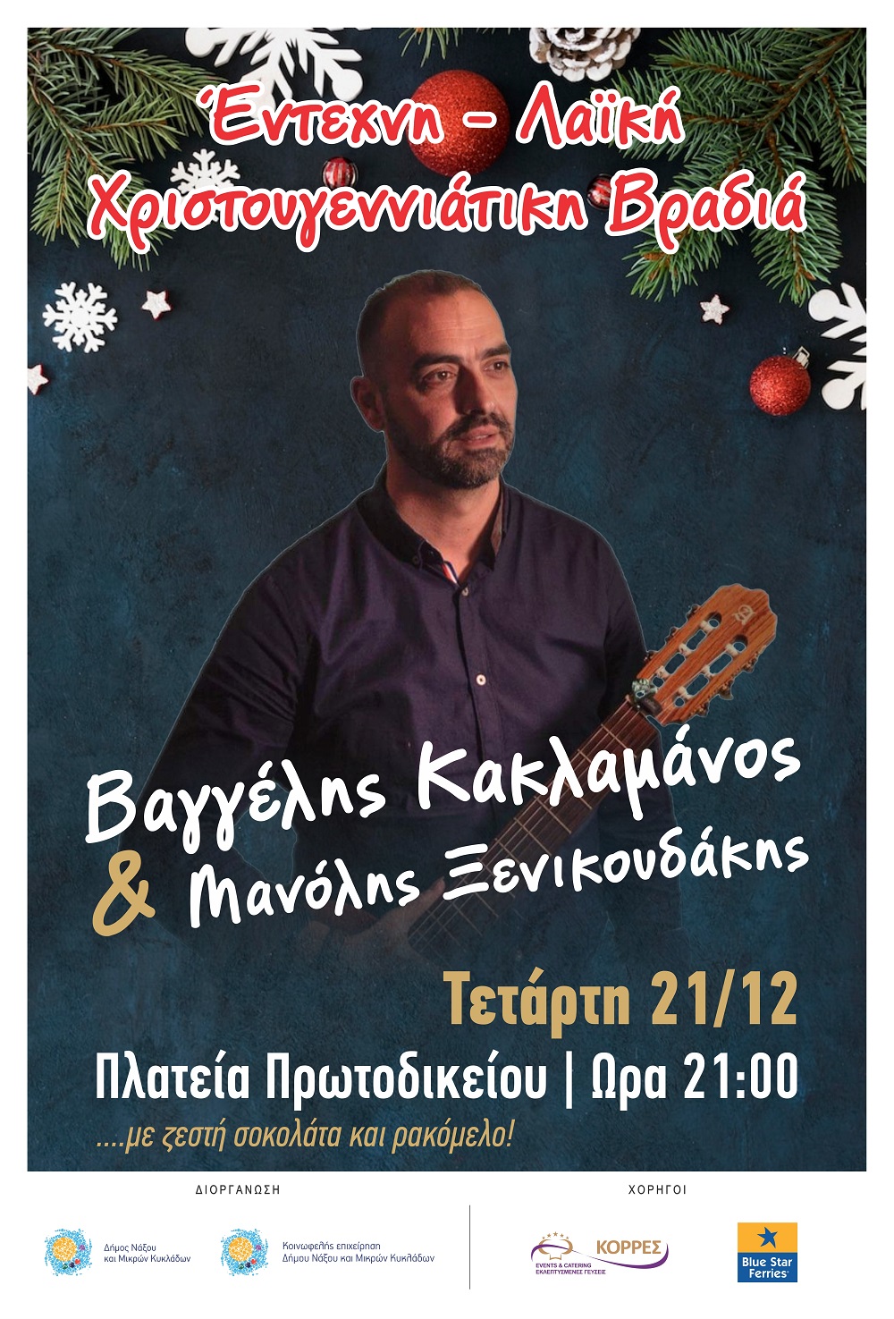 Στο πλαίσιο των εορταστικών εκδηλώσεων των Χριστουγέννων, την Τετάρτη 21 Δεκεμβρίου, στις 21:00. θα πραγματοποιηθεί μουσική εκδήλωση, στην Πλατεία Πρωτοδικείου στη Νάξο με τον Βαγγέλη Κακλαμάνο και τον Μανόλη Ξενικουδάκη.