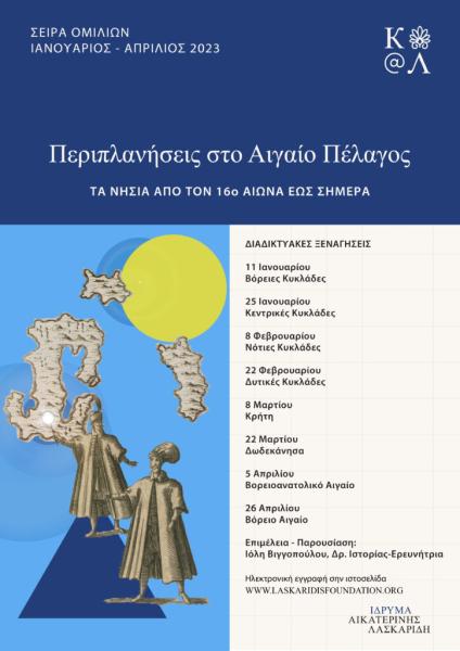 Μετά την επιτυχία των διαδικτυακών ξεναγήσεων στη Μικρά Ασία, το Ίδρυμα Αικατερίνης Λασκαρίδη διοργανώνει έναν νέο κύκλο συναντήσεων με θέμα το Αιγαίο Πέλαγος. Με αφορμή τον διαδικτυακό τόπο Travelogues – Με το Βλέμμα των Περιηγητών, η δράση αυτή έχει στόχο να ταξιδέψει το κοινό στη νησιωτική παράδοση του Αιγαίου από τον 16ο αιώνα μέχρι σήμερα.