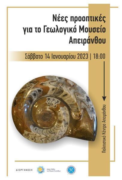 Ο Δήμος Νάξου και Μικρών Κυκλάδων πραγματοποιεί εκδήλωση με θέμα «Νέες προοπτικές για το Γεωλογικό Μουσείο Απειράνθου», με αφορμή τη συνεργασία με την Ελληνική Αρχή Γεωλογικών και Μεταλλευτικών Ερευνών για την υποστήριξη του Γεωλογικού Μουσείου της Απειράνθου και την ανάδειξης της γεωλογικής και μεταλλευτικής κληρονομιάς της Νάξου και των Μικρών Κυκλάδων. Η εκδήλωση θα γίνει το Σάββατο 14 Ιανουαρίου 2023, στις 18:00 στο Πολιτιστικό Κέντρο Απειράνθου.